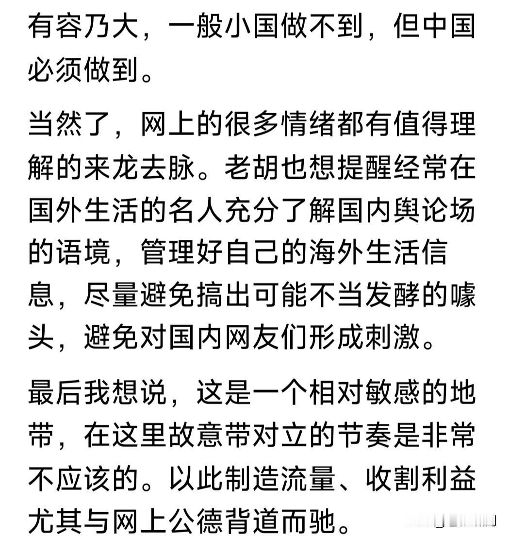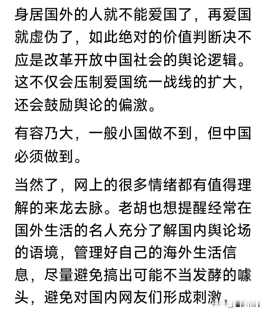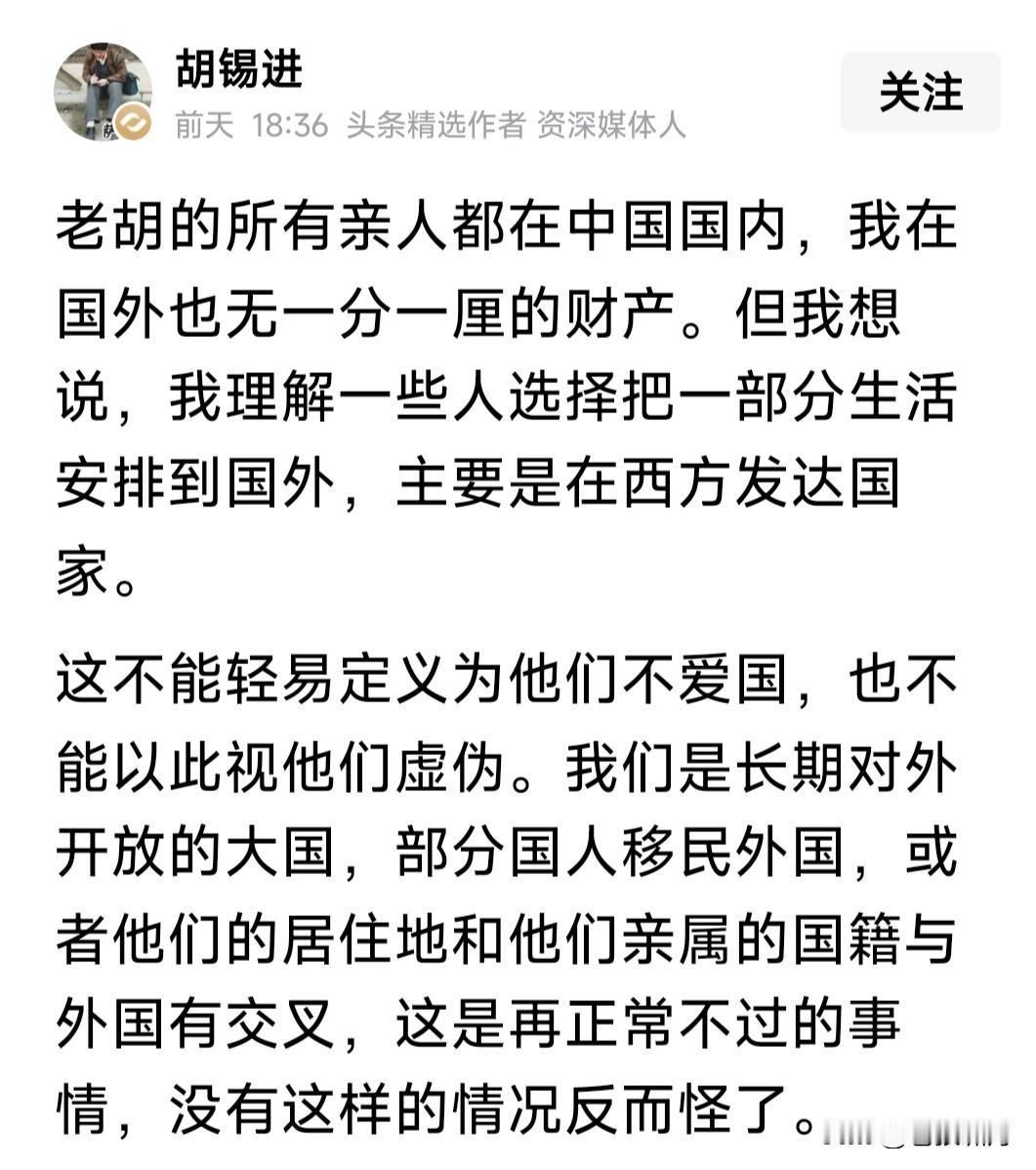 多日不见老胡,今日总算又见!还是那副腔调,左右逢源随风摇曳,但总体来看,说的还算有道理。 这篇文章,说的是“爱国”老话题,但说得基本还在理。主要谈几个方面: 1.他与亲属都在中国,国外没有一分一毫财产,但他理解那些去西方发达国家留学工作与移民的人。 2.我们不能以此为据,就说这些人不爱国。当前改革开放合作发展,这些很正常,没有反而不正常。 3.国内网友要理解世界交流重要性,人才交流移民流动很正常。有人以此煽动情绪制造对立,获取流量利益,影响改开大局,是不负责任。 老胡以上观点,说出本人想说的!因此对老胡表示支持。我们今天的成就,都是改革开放硕果。深化改革持续发展,中国才能越来越好啊! …………