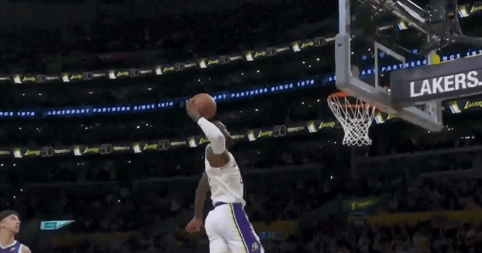 詹姆斯抱怨裁判被犯规未吹,随后前场接球起飞滑翔战斧劈扣