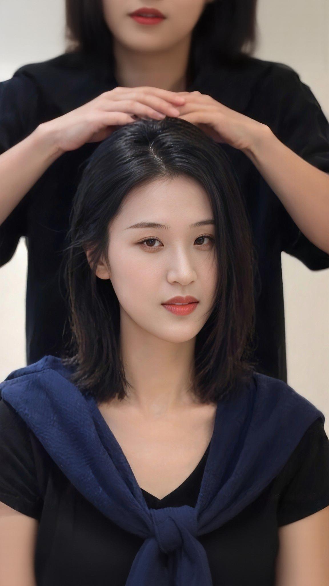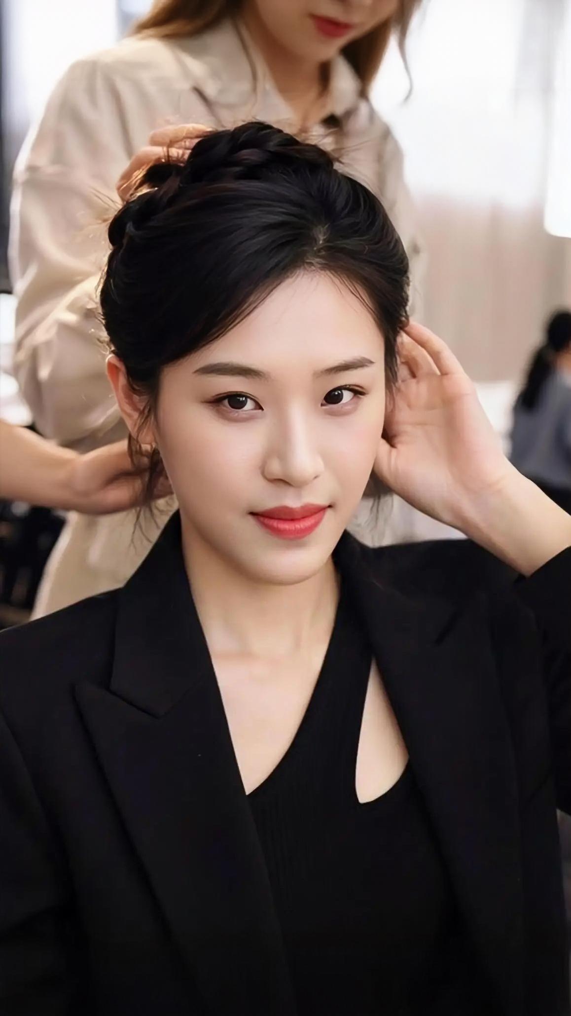 为悦己者容 素手轻拈粉扑扬, 鬓边匀色衬红妆。 眸含浅笑眉如黛, 一镜春风入鬓长