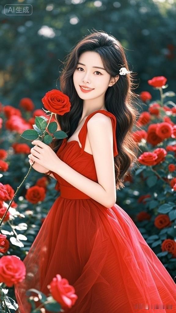 在玫瑰花园中,温柔微笑的少女与红玫瑰相映成趣,浪漫气息扑面而来。🌹💕