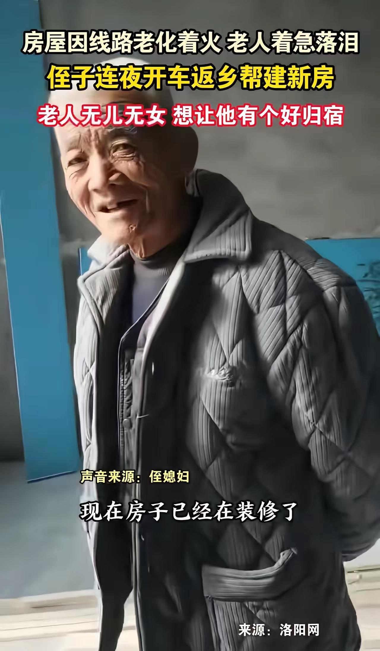 “侄子门前站,就不是绝户汉”!河南周口,老人无儿无女,房屋线路着火,老人着急落泪,一夜没睡。侄子听到消息,连夜开车返乡帮建新房!侄子:“他没孩子,我就是他的孩子,想让他有个好归宿!”网友:侄子是好侄子,侄媳妇才是宝! 事情发生在5月26号,对于周口这位老人来说,这天差点就垮了,老人一辈子没儿没女,就守着自己那间老房子过日子,没成想一场大火把一切都烧没了。 起火原因是线路老化,火起来的时候特别猛,等周围邻居帮忙把火扑灭,房子已经成了一片废墟,连个下脚的地方都难找。 老人在废墟跟前坐了一整夜,眼睛都哭肿了,他这辈子省吃俭用,好不容易攒下3000块钱,藏在房子里,着火的时候他急着进去拿,双手被烫得全是水泡,看着都揪心。 更危险的是,院子里停着他唯一的电动车,那是他平时出门的依靠,火最大的时候他还想往里冲,幸亏邻居们死死拉住,不然真不敢想会出啥事儿。 无儿无女的老人,此刻心里肯定特别绝望,不光是今晚没地方住,更怕自己后半辈子就这么没个着落。 他坐在那儿,脸上全是烟灰,浑身都透着一股凄凉劲儿,周围邻居看着都觉得心疼,却也只能劝几句,帮不上太大的忙。 老人没想到的是,远在千里之外浙江打工的侄子,很快就知道了家里的事儿,侄子一听说叔叔家着火,房子没了,人还受了伤,当下就跟媳妇商量着回家。 两人连行李都没仔细收拾,简单归置了一下就上了车,连夜往河南赶,这一路十几个小时,两人几乎没怎么休息,就想着能快点赶到叔叔身边。 等侄子赶到老家,看到坐在废墟边无助发呆的叔叔,心里别提多难受了,他赶紧走过去扶起叔叔,看到叔叔手上的水泡,眼圈一下子就红了。 侄子没说太多客套话,就想着先给叔叔找个临时住的地方,然后琢磨着重新盖房子。 都说“侄子门前站,就不是绝户汉”,这话在这儿真应验了。侄子心里很清楚,叔叔没孩子,自己作为侄子,就该担起照顾的责任。 他跟叔叔说自己就是他的孩子,不是随口安慰,而是真的打算好好安顿叔叔的晚年。 要盖房子可不是小事,不光费钱还费精力,侄子跟媳妇提这件事的时候,心里还稍微有点忐忑,没成想媳妇半点犹豫都没有,直接就同意了。 这一点也被网友看在眼里,大家都说侄子靠谱,侄媳妇更是个宝。毕竟这年头,要是家里媳妇不支持,侄子就算想帮忙,也难免会有矛盾。 有了媳妇的支持,侄子干活也更有劲头了,接下来就开始忙着处理废墟、找施工队、买建材,每天天不亮就起来忙活,直到天黑才歇着,把所有精力都放在盖房子上。 周围也有人说闲话,说侄子这么卖力,说不定是惦记老人的宅基地,或者想着以后可能有拆迁款,不然犯不着这么费心费力。 面对这些流言蜚语,侄子压根没放在心上,还是一门心思盖房子。 他盖房子的时候特别用心,不是随便盖个能住人的棚子,而是盖了一栋两层的小洋楼,窗户宽敞明亮,地面也铺得平平整整,比老人之前的老房子好太多了。 其实大家心里都清楚,要是真为了宅基地,没必要盖这么好的房子,侄子就是想让叔叔能住得舒服,能挺直腰杆安度晚年。 之前老人住的老房子,冬天漏风夏天漏雨,现在有了这栋新房子,再也不用受那个罪了,这不仅是给老人盖了个遮风挡雨的地方,更是给了老人活下去的底气和希望。 对于无儿无女的老人来说,以前可能总担心自己老无所依,被人说“绝户”,但自从侄子站出来,帮他盖房子,承诺照顾他以后的生活,老人脸上的笑容也多了起来。 他知道自己不是孤单一人,有侄子两口子惦记着,后半辈子有了着落。 眼看年底房子就能完工,老人就能搬进新房子过年了,那些关于宅基地的闲话,在老人安稳的晚年面前,显得特别可笑。 这世上最珍贵的从来不是算计来的利益,而是危难时刻有人愿意伸出援手,是亲情带来的温暖。 大家对此怎么看?欢迎评论区留下您的观点!