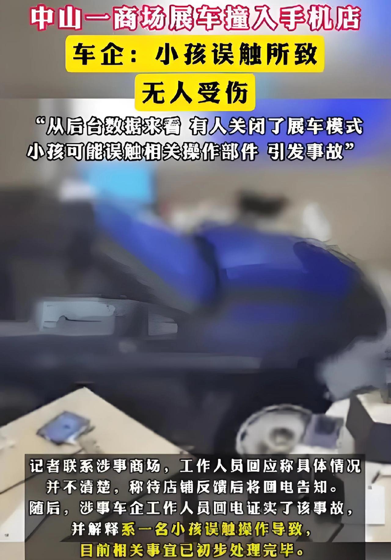 吓懵了!中山商场小孩误触展车,直接撞进手机店,车企回应了… 12月27日广东中山万象汇商场里,一辆参展的汽车因为孩子误触操作,径直撞进旁边的手机店,店铺墙面直接被撞坏,手机店的展柜、设备也不同程度受损,现场一片狼藉。万幸的是这次事故没有人员伤亡,车企工作人员也出来说明,是展车模式被关闭后,孩子误触部件才引发的意外。 这事一出网友立马吵开了:有人说“熊孩子闯祸,家长必须赔到底”;也有人质疑车企,“展车安全设置这么儿戏?明显是安全漏洞”;还有人觉得商场也有责任,没做好现场管控。 到底是家长监管不到位,还是车企、商场的安全责任没做到位?评论区说说你的看法!