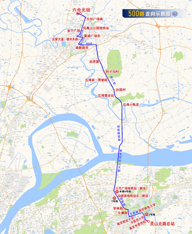 公交500路由六合北站开往灵山北路总站,串联六合与仙林两大区域。线路走向科学高效,从六合北站出发后,沿雄州东路、冶六线,随后驶入仙新路高架,直跨新生圩长江大桥过江,再经仙新路抵达仙林大学城核心区,全程无绕路,实现两地“直达式”联通。不仅可高效衔接南京地铁2号线、7号线、S8号线,同时还覆盖六合北站、方州广场南、棠城广场东等重要交通集散地。既满足了六合中心区居民的跨江出行需求,也让该线路在棠城广场东站可与扬州仪征99路无缝衔接,让跨市出行更省心。