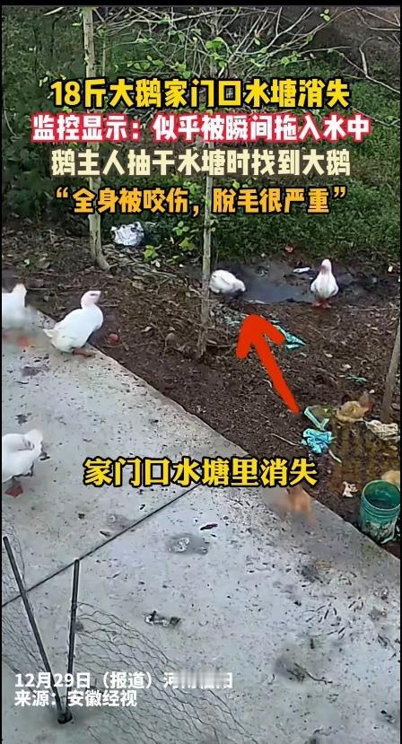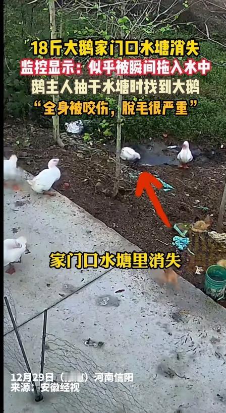 近日,河南信阳的曹先生最近可闹心了——他家养了大半年的18斤大鹅,在自家门口水塘边,一眨眼的功夫,说没就没了! 那天就是再平常不过的一天,大鹅跟往常一样,迈着八字步去水塘边溜达、啄草籽。 谁能想到,不一会儿大鹅没有影了,他只好查看家里的监控,寻找原因,这不查不知道,一查监控可把曹先生吓得后脖梗子冒凉气:监控中大鹅像是被啥东西猛一拽,“扑通”一声就被拖进水里,眨眼间就没影了! 曹先生心想;这水塘最深的地方得有两三米,浑乎乎的水面下,跟藏着怪物似的。 平日里在院里昂首挺胸、凶巴巴的大鹅,这会儿软得像片纸,那场景,谁看了心里不得咯噔一下? 曹先生又急又疼,啥也顾不上了,当场就拍板:抽干水塘,找鹅! 为了快点把水弄干,他还专门喊来挖掘机帮忙。水塘里的水一点点往下落,泥坑露出来的时候,曹先生一眼就瞅见了自家大鹅。 可眼前这模样,让他鼻子一酸,眼圈都红了——大鹅趴在烂泥里,脖子上被咬出个血窟窿,肚子底下烂糟糟的,连腿上都有几道深口子,浑身的毛掉得稀里哗啦,蔫头耷脑的,连“嘎嘎”叫的力气都没了,哪儿还有半点往日的威风? 曹先生在泥塘里翻来翻去,除了这只快不行的大鹅,啥可疑东西都没找着。 更让他发毛的是,后来一打听,村里这阵子已经丢了好几只鹅了!看着自家大鹅这伤,曹先生心里直犯嘀咕:怕不是水塘里藏着大蛇,或是成了精的大黑鱼吧? 可水塘的水还没抽干净,到底是啥东西在作祟,到现在还是个谜。这没露面的“坏东西”,光想想就让人头皮发麻。 在曹先生眼里,这大鹅哪是只普通的家禽啊,那是天天陪着他的伴儿,是农家小院里最有烟火气的活计。 每天早上,听着大鹅“嘎嘎”的叫声醒过来。傍晚,看着它摇摇摆摆跟着鸡鸭回窝,这日子才叫有滋味。 现在大鹅虽然找回来了,可水塘里的危险还在,村里接连丢鹅的事,也让大伙儿心里悬着。 网友们刷到这事儿,也都跟着揪心:“好好的大鹅遭这罪,直言太心疼了。” 还有的网友说:“赶紧把水塘里的‘元凶’揪出来”。 说到底。农家的好日子,从来都藏在这些鸡飞狗跳又暖乎乎的小事里。只盼着这只受了重伤的大鹅,能早点好起来,再在院子里昂首挺胸地溜达。 也希望曹先生和村里的人,能早点揪出水塘里的“坏东西”,让村里的日子重新回到安稳。