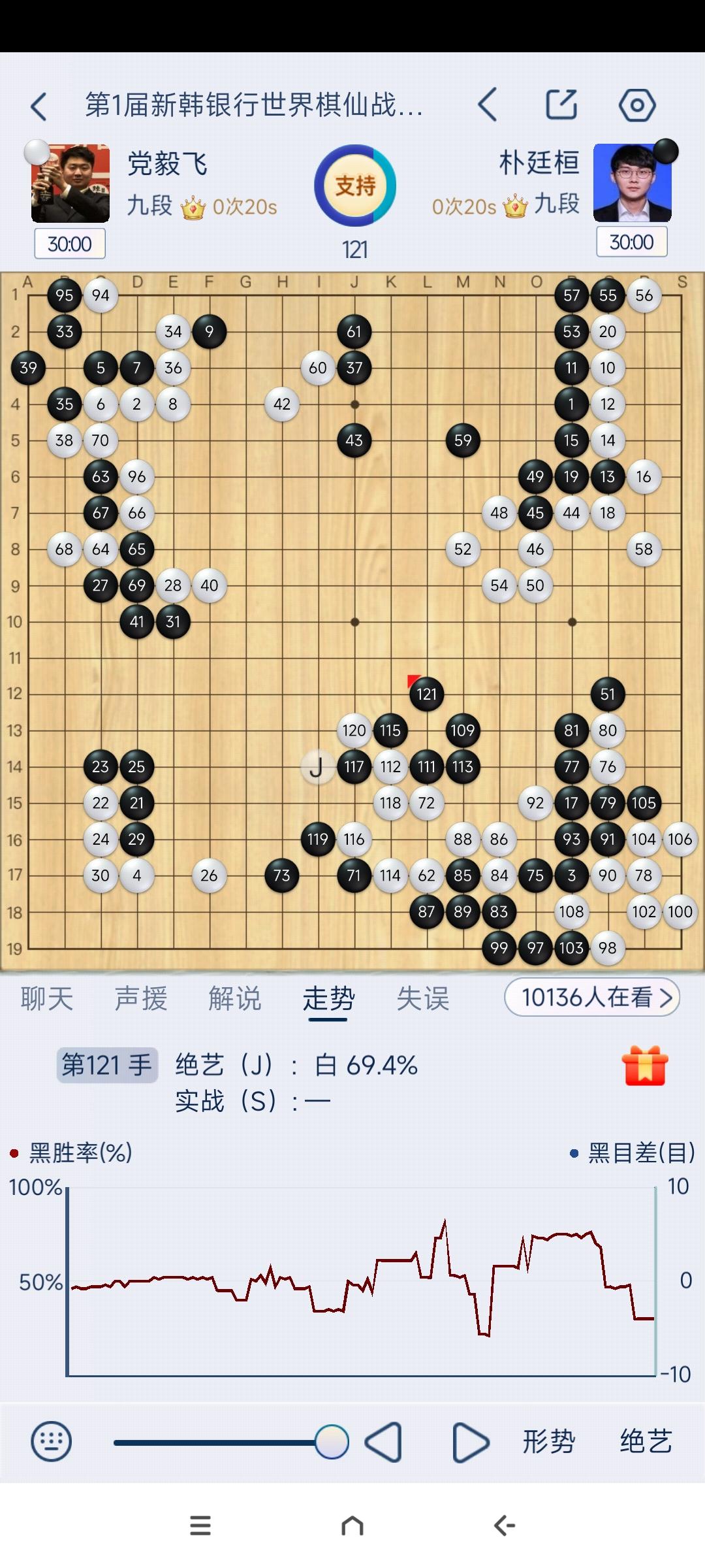 党毅飞执白领先朴廷桓! 12月29日13点,第一届新韩银行“棋仙杯”第二场半决赛落子,中国棋手党毅飞九段执白后行对阵朴廷桓九段。 在第一场半决赛中,中国王星昊九段执黑271手中盘击败日本芝野虎丸九段,率先晋级决赛。 弈至121手,局面上党毅飞领先!