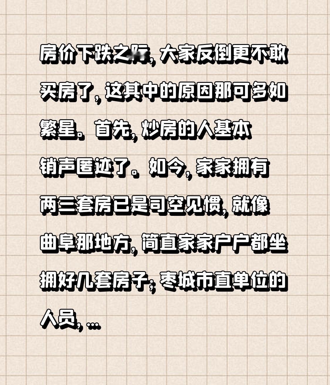 房价下跌之际,大家反倒更不敢买房了,这其中的原因那可多如繁星。首先,炒房的人基本销声匿迹了。如今,家家拥有两三套房已是司空见惯,就像曲阜那地方,简直家家户户都坐拥好几套房子;枣城市直单位的人员,市中、新城各有一套房也不足为奇。房子既不能当美食享用,又不能当作好玩的物件,炒房毫无动力可言,自然也就无人问津了。 其次,老百姓需要花钱的地方犹如无底洞。就拿亲戚家来说,孙子上学可能就得花一大笔钱,谁敢把钱都一股脑儿拿去买房呢? 另外,从投资的角度来看,房子占据家庭总资产的60%左右,人们都渴望资产能够保值增值,房价下跌无疑极大地影响了购房意愿。现在县城房价每平降个2000元、地级市每平降个5000元都成了常态,可大家依旧是小心翼翼,不敢轻易出手买房。