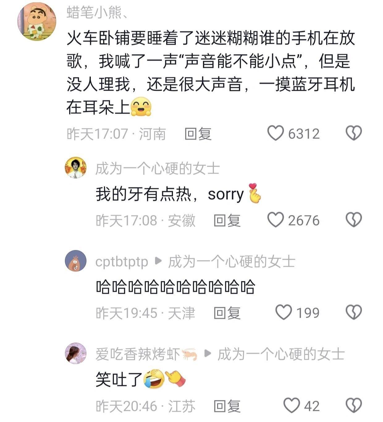 火车卧铺要睡着了,迷迷糊糊谁的手机在放歌,我喊了一声"声音能不能小点",但是没人理我,还是很大声音,一摸蓝牙耳机在耳朵上