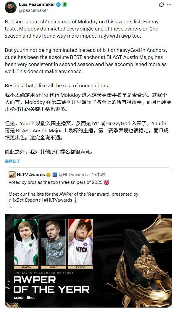“个人不太认可这份狙击手榜单里用sh1ro替代Molodoy。在我看来,Molodoy下半赛季的表现碾压榜单里其他所有狙击手,用狙打出的关键击杀也远比其他人多。但最离谱的是,主区这个位置提名了b1t和heavyGod,却没给yuurih?他可是BLAST奥斯汀major上公认的最强主区防守者,而且下半赛季全程稳定在线,成绩也更突出,这评选完全说不通。除此之外,剩下的提名我都没意见。”