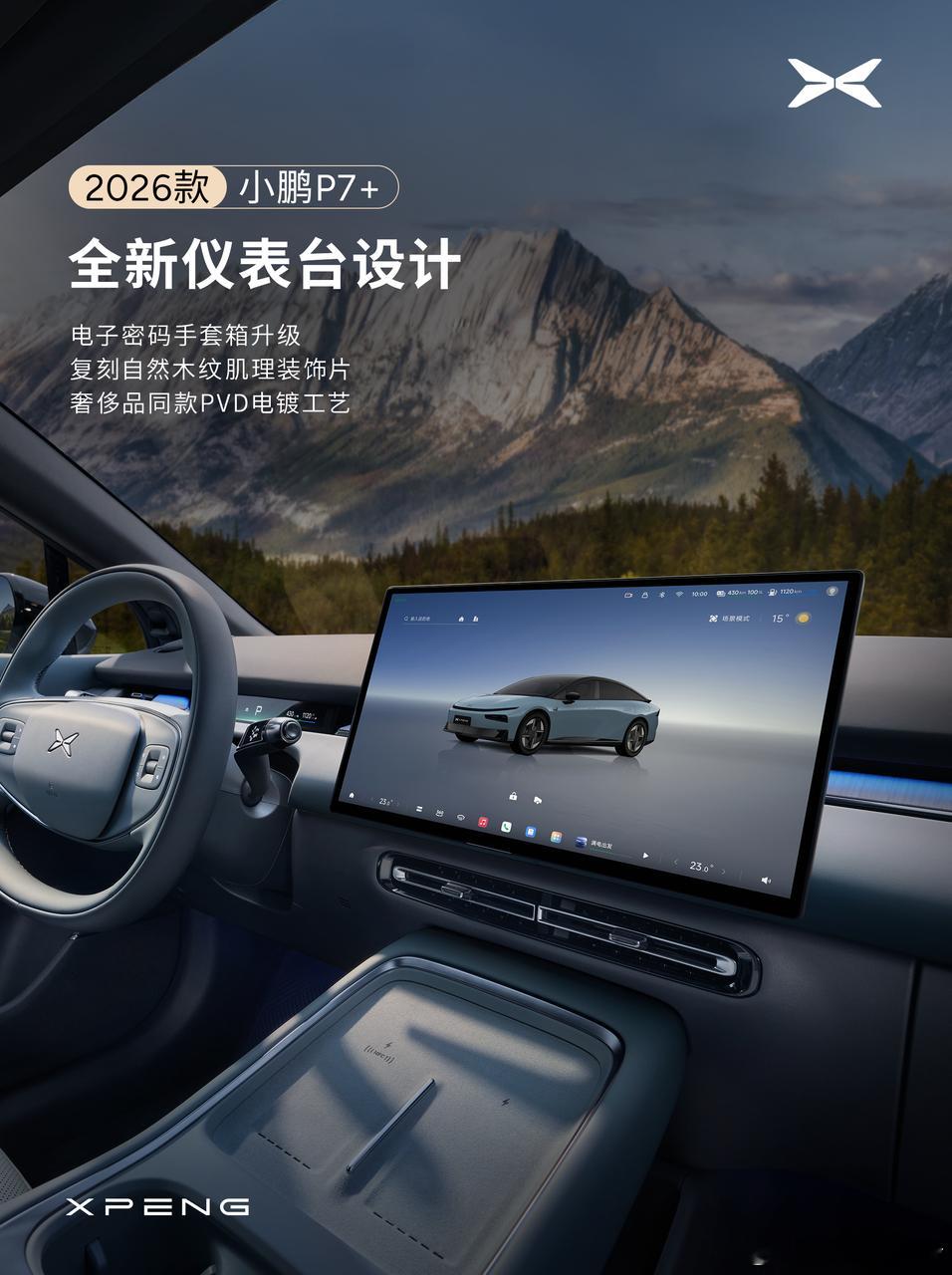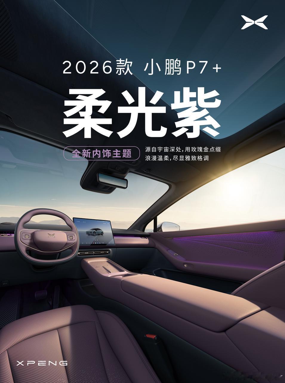 2026款小鹏P7+内饰首曝,以豪车级工艺重塑轿跑空间。新增柔光紫、晨雾蓝2款内饰新色,融合玫瑰金与液态金属细节,尽显高级。新增29英寸全场景HUD抬头显示,升级8.8英寸科技岛仪表台;更有隐藏式出风口、256色星瀑氛围灯等,打造属于P7+的极致舒适的移动生活空间。新款小鹏P7+质感全面升级新款小鹏P7+内饰首曝