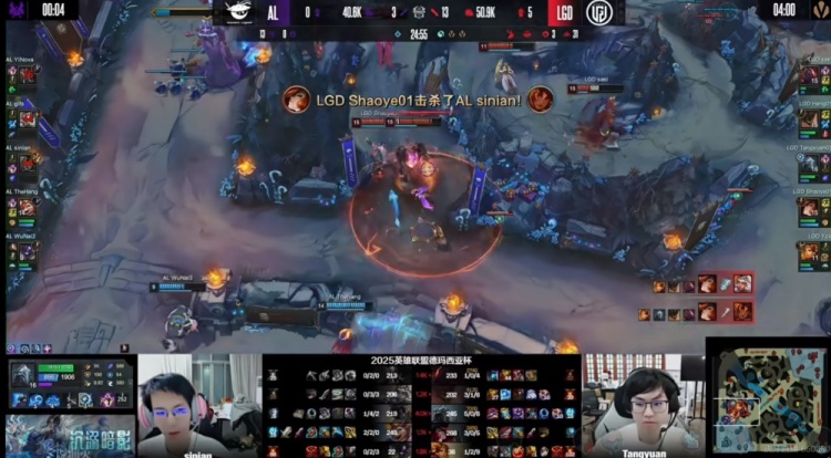 [15:25]先锋团,AL先开团但是正面Shaoye女枪大招没人管AOE输出拉满,WuNai3牛头倒下之后TheHang斯莫德也被Tangyaun维克托电死,残局YiNova雷克塞姗姗来迟结果还被Tangyuan金身秀了!这波LGD打出0换4!拿下先锋!4K经济差了!