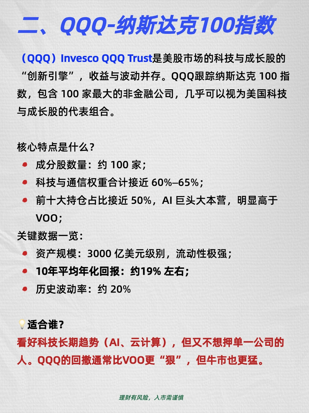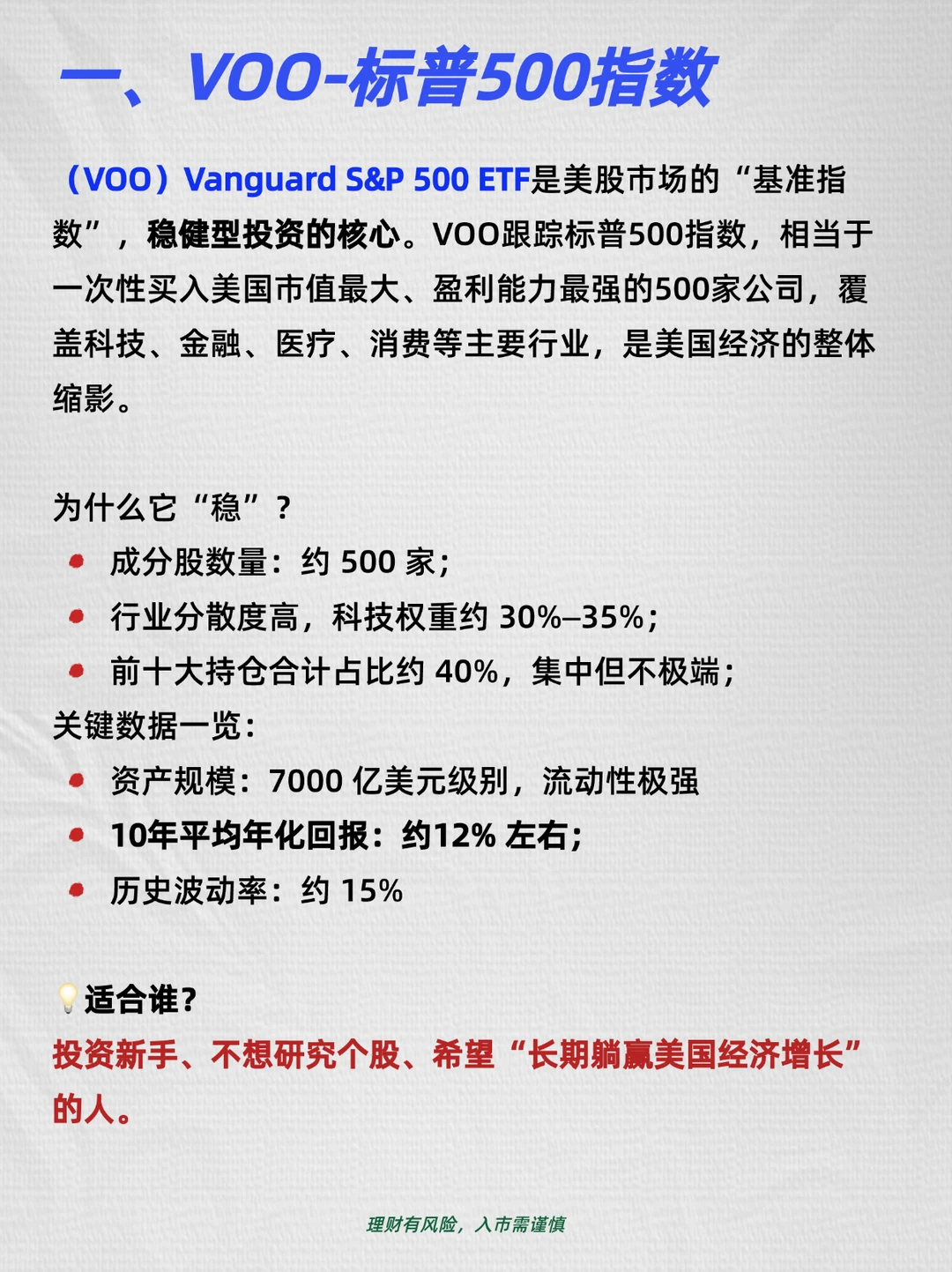 对很多投资者来说,美股是全球资产配置里绕不开的一环。但真正的问题在于:面对上万只股票,普通人到底该怎么选? 一个现实的答案是:与其纠结个股,不如通过几只成熟、低成本的 ETF,直接买下美国最核心的资产。 [向右R]这篇只讲三只在美股市场里长期被验证、逻辑最清晰的ETF:VOO、QQQ、VGT。它们的重仓股高度重合,但投资哲学完全不同。 财经知识 投资 金融知识 金融 股票 股市 投资理财 个人投资者 美股 纳指