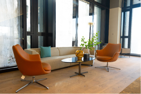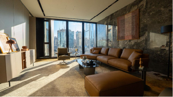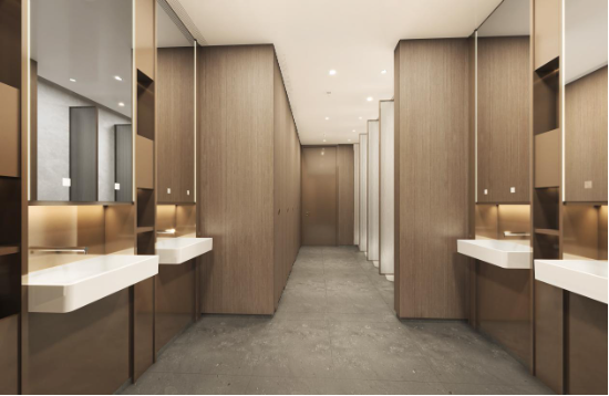 公共区域多选用温润的木质家具,并点缀以自然花饰,柔化建筑结构的“冷硬”感,与项目的绿色健康主题相呼应。卫生间则遵循“英国绅士俱乐部”理念,采用独立式洗手台与深色木纹墙面,营造出私密、尊贵的氛围。
