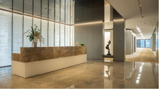 在CBD一众超高层写字楼中,维晟中心的外观显得独特而考究,它摒弃了传统写字楼纯玻璃幕墙的立面风格,以“石材+金属+玻璃幕墙”的三重奏构建了精致的建筑语言。