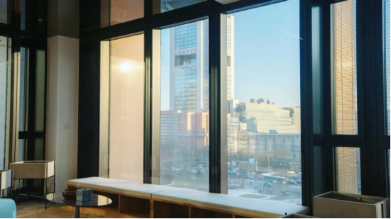 自然通风是这套系统的亮点。在办公区,幕墙每12米设有一组与立面高度整合的竖向开启扇,向外推开即实现高效自然通风,且完全不影响室内使用空间。