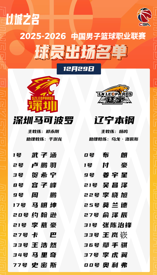 虎扑12月29日讯今日CBA常规赛,深圳对阵辽宁的大名单已经出炉。