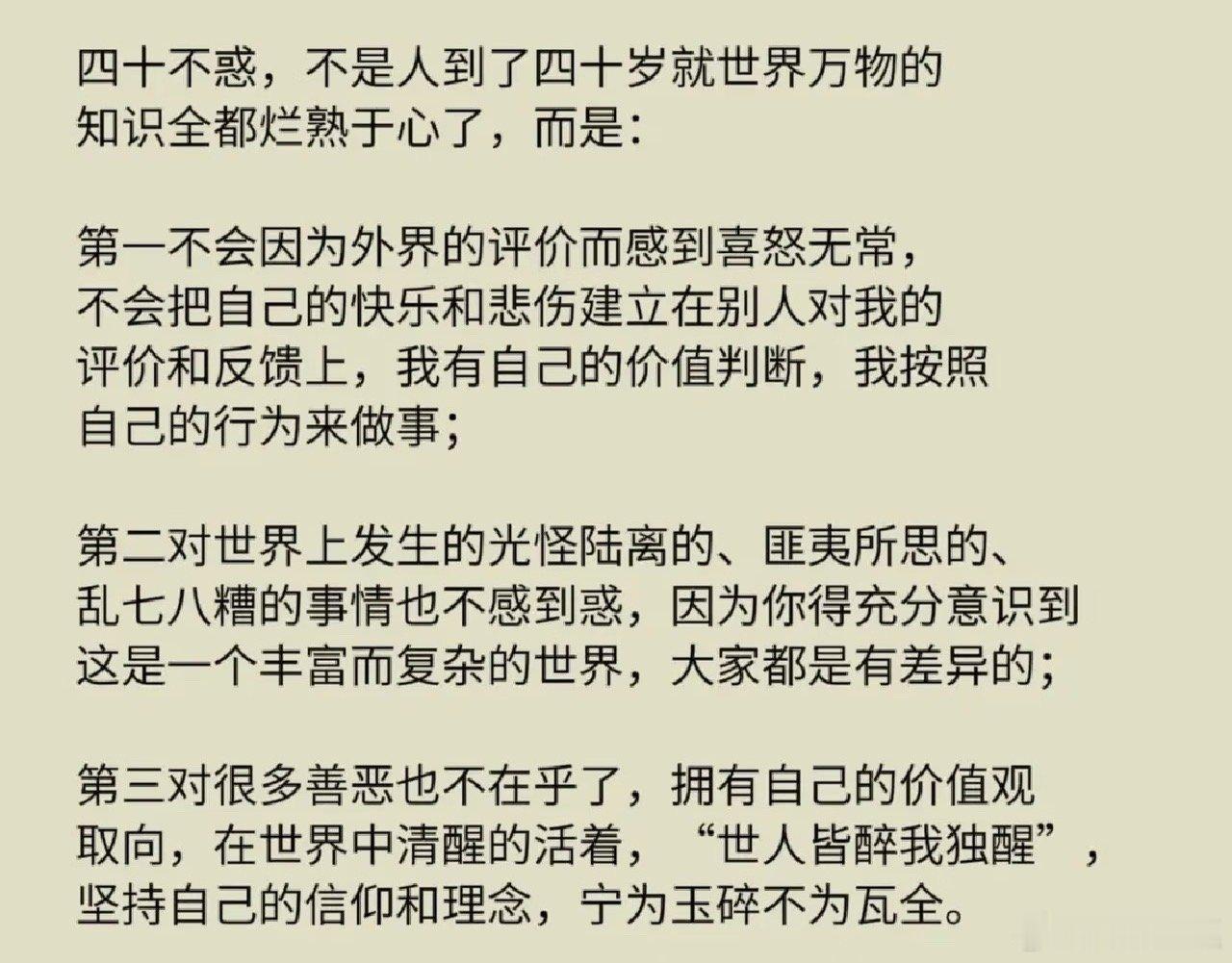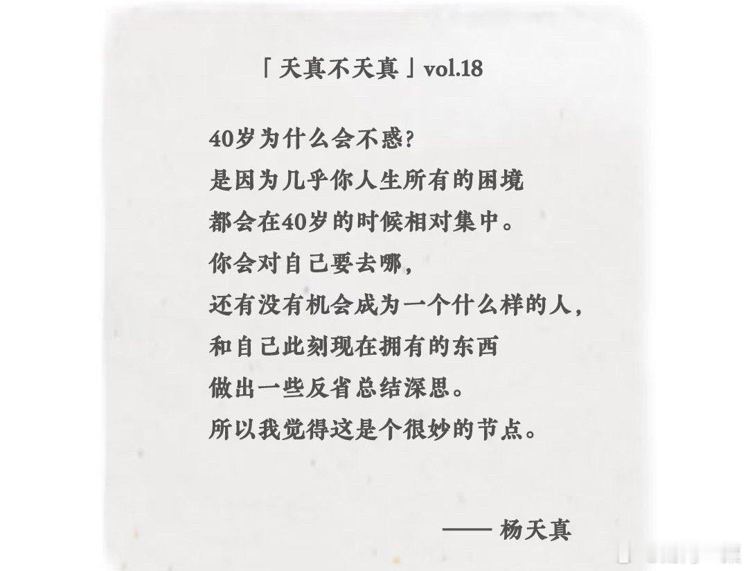 那句古话“四十不惑”是出自《论语》,是孔子对自己人生阶段的总结。他说自己 “四十而不惑” ,但这 “不惑” 指的究竟是什么?其实并非指什么都懂了、没有疑问了,而更多是指在经历和思考后,对自己的人生原则、价值追求和是非判断,有了一种内在的坚定和明晰。是对“自己要做什么样的人、遵循什么道”不再轻易迷茫。放到今天,世界变化的速度远超古代,信息、选择、可能性都爆炸式增长。我们面对的已不仅仅是个人修养和道德命题,还有职业波动、技术颠覆、多元价值碰撞等复杂挑战。 “惑” 的总量可能不减反增。所以像杨幂这样,到了40岁依然坦言有困惑,非但不是“不合格”,反而特别真实,甚至是现代常态。或许,现代版的 “不惑” ,不再是疑问的消失,而是指:1. 接纳困惑的常态:明白困惑本身也是生活的一部分,是面对复杂世界的诚实反应。2. 具备探索的韧性:在变化中保持学习和调整的能力,不因困惑而止步。3. 守住核心的定力:在纷繁的选择和声音中,越来越清楚对自己真正重要的是什么。年龄带来的可能不是标准答案,而是更清晰的自我觉察、更成熟的应对心态,以及和困惑共处甚至从中获得养分的能力。
