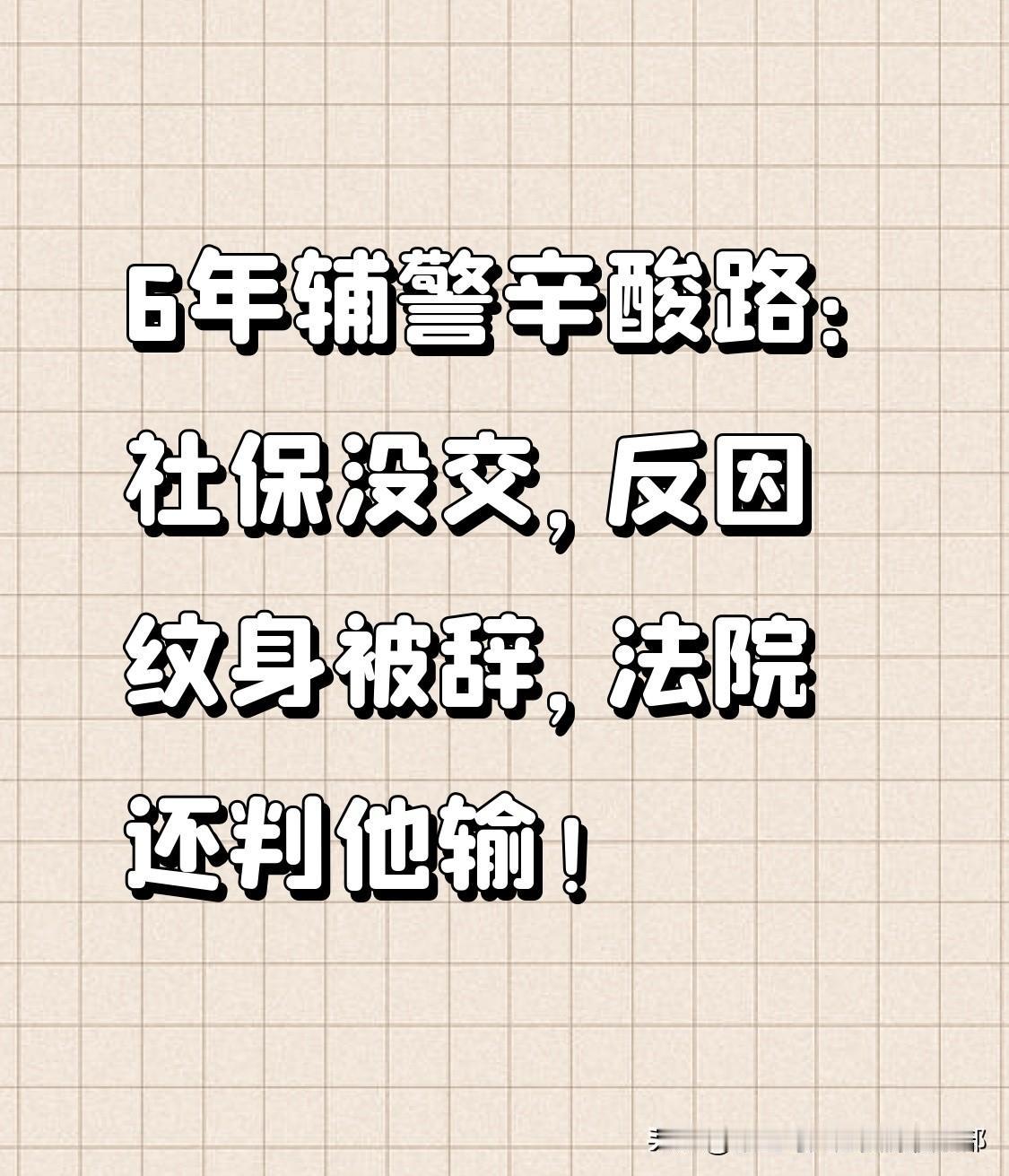 6年辅警辛酸路:社保没交,反因纹身被辞,法院还判他输! 吉林农安县有个哥们儿刘某,干了快六年的辅警,每天风吹日晒执勤站岗,结果单位一分钱社保都没给他交过!他多次找领导讨说法,没等来社保,反而等来一纸辞退通知,理由居然是他入职前就有的文身“不合格”。这哥们儿一气之下把单位告上法院,要求补偿6万并补缴五险一金,可法院的判决让他彻底傻眼——一分钱没赔,社保也没补成! 刘某是2019年9月通过正规招聘进的农安县公安局交通管理大队,虽然只是个辅警,但这份工作在他和亲友眼里也算体面稳定。六年里,他早晚高峰执勤、查酒驾、处理事故,活儿没少干,加班到深夜是家常便饭,从未因工作出错挨过批评。可时间一长,他发现工资条上始终没有社保记录,身边同事提醒他“辅警也该依法交社保”,他才意识到问题严重了。 从2019年起,刘某就开始为社保的事儿奔波,一次次找中队和大队领导协商,结果不是被“再等等”搪塞,就是以“临时用工”为由推脱。他越想越委屈:干着和正式交警一样的活,扛着同样的风险,连最基本的医疗养老保障都没有!没想到2024年初,单位突然让他和县公安局签了新合同,原用工协议终止,社保问题只字未提。更离谱的是,没多久单位就以“文身不符合岗位形象”把他辞了——可这文身他入职前就有,体检政审时没人提,干了六年也没人说不行! 刘某咽不下这口气,一纸诉状告到法院。可庭审中,单位辩称他的劳动关系早已变更为县公安局,交管大队只是代为通知辞退。法院最终以“超过一年仲裁时效”和“起诉主体错误”驳回了他的全部请求。原来,刘某与交管大队的劳动关系2023年底就终止了,他2025年才起诉,确实晚了! 这事儿看得人心里拔凉。六年青春换来一场空,单位违法不交社保,最后用个“陈年纹身”当借口辞人,法院还因程序问题判劳动者输!打工人们可得长点心:维权一定要趁早,社保问题发现就得追,合同主体变更要留证据,别像刘某一样吃哑巴亏!