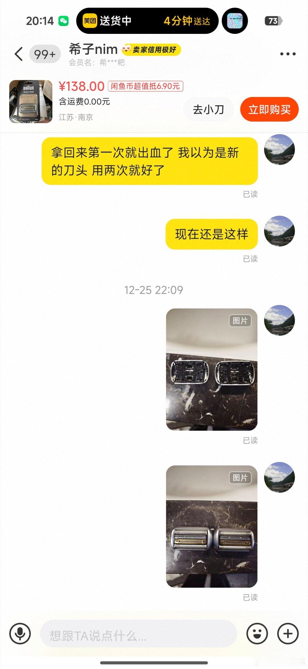 有的时候就得一步到位 越是想节约越是得不偿失 我的剃须刀博朗9系列的 原装的刀头已经有点刮不干净了 我就想买一个替换,原厂刀头一个399 我觉得太贵了,好多新的剃须刀也没这么贵 于是在某🐟里去找了一家说是原装刀头 其实我也想着不管是不是原装的,130块钱,只要好用就行 结果拿回来刮了几次,很容易刮出血,而且刮不干净我以为是新的需要磨合一下,结果用了十几次了,还是很容易划破,这个时候我才意识到,这踏马就是小作坊里的玩意儿 我就又重新买了一个刀头,根本就不疼,刮的特别干净,到头来还是没有节约到,还遭罪,联系卖家,这比给我装哑巴,已读不回,给差评还过了时间哈哈哈哈哈哈 武汉