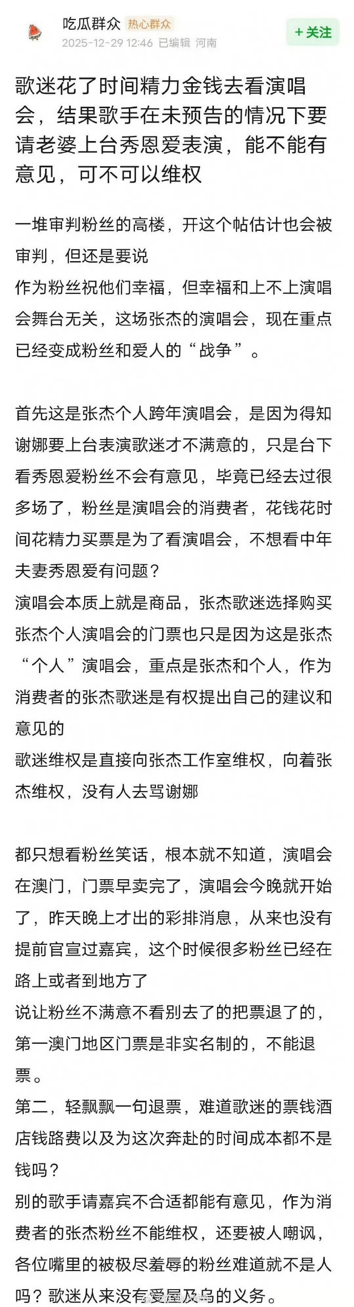 我其实不太能理解张杰为啥非得让粉丝接受谢娜甚至还捆绑上了好男人的名声好像大家不接受谢娜出席,就是在阻拦他做好男人一样他和谢娜也结婚这么多年了唯粉对谢娜有多抵触他是心知肚明的如果不care粉丝的反对那就应该早早说明这样不喜欢花钱看正主秀恩爱的就不用去抢票,省点钱干啥不好总不能是这么大个歌手,还差那几张票吧张杰演唱会回应争议张杰梦女