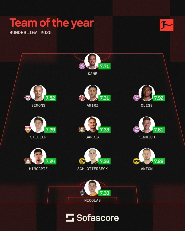 前卫:哈维·西蒙斯(莱比锡,7.52分)、阿米里(美因茨,7.31分)、奥利塞(拜仁,7.92分)