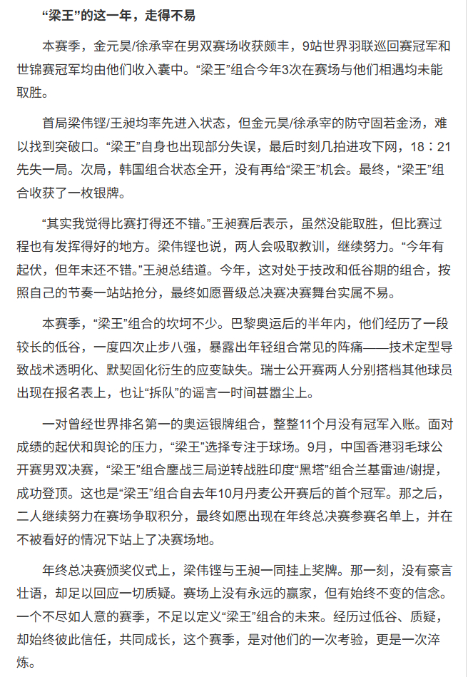 梁王驾到梁王组合 梁王加油 -赛事图文-2025世界羽联年终总决赛相关新闻报道“梁王”的这一年,走得不易本赛季,金元昊/徐承宰在男双赛场收获颇丰,9站世界羽联巡回赛冠军和世锦赛冠军均由他们收入囊中。“梁王”组合今年3次在赛场与他们相遇均未能取胜。首局梁伟铿/王昶均率先进入状态,但金元昊/徐承宰的防守固若金汤,难以找到突破口。“梁王”自身也出现部分失误,最后时刻几拍进攻下网,18∶21先失一局。次局,韩国组合状态全开,没有再给“梁王”机会。最终,“梁王”组合收获了一枚银牌。“其实我觉得比赛打得还不错。”王昶赛后表示,虽然没能取胜,但比赛过程也有发挥得好的地方。梁伟铿也说,两人会吸取教训,继续努力。“今年有起伏,但年末还不错。”王昶总结道。今年,这对处于技改和低谷期的组合,按照自己的节奏一站站抢分,最终如愿晋级总决赛决赛舞台实属不易。本赛季,“梁王”组合的坎坷不少。巴黎奥运后的半年内,他们经历了一段较长的低谷,一度四次止步八强,暴露出年轻组合常见的阵痛——技术定型导致战术透明化、默契固化衍生的应变缺失。瑞士公开赛两人分别搭档其他球员出现在报名表上,也让“拆队”的谣言一时间甚嚣尘上。一对曾经世界排名第一的奥运银牌组合,整整11个月没有冠军入账。面对成绩的起伏和舆论的压力,“梁王”选择专注于球场。9月,中国香港羽毛球公开赛男双决赛,“梁王”组合鏖战三局逆转战胜印度“黑塔”组合兰基雷迪/谢提,成功登顶。这也是“梁王”组合自去年10月丹麦公开赛后的首个冠军。那之后,二人继续努力在赛场争取积分,最终如愿出现在年终总决赛参赛名单上,并在不被看好的情况下站上了决赛场地。年终总决赛颁奖仪式上,梁伟铿与王昶一同挂上奖牌。那一刻,没有豪言壮语,却足以回应一切质疑。赛场上没有永远的赢家,但有始终不变的信念。一个不尽如人意的赛季,不足以定义“梁王”组合的未来。经历过低谷、质疑,却始终彼此信任,共同成长,这个赛季,是对他们的一次考验,更是一次淬炼。©️体坛报网页链接
