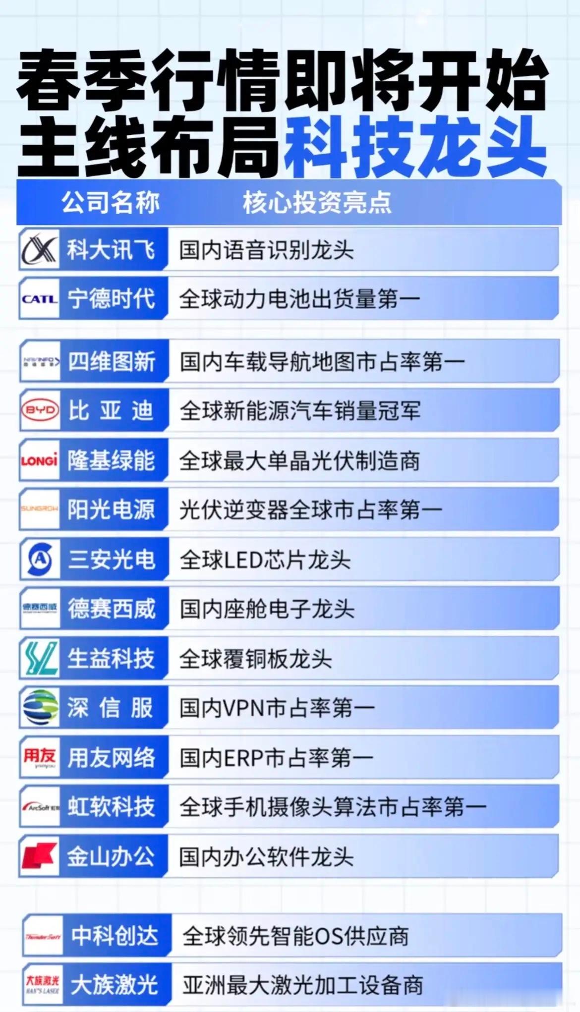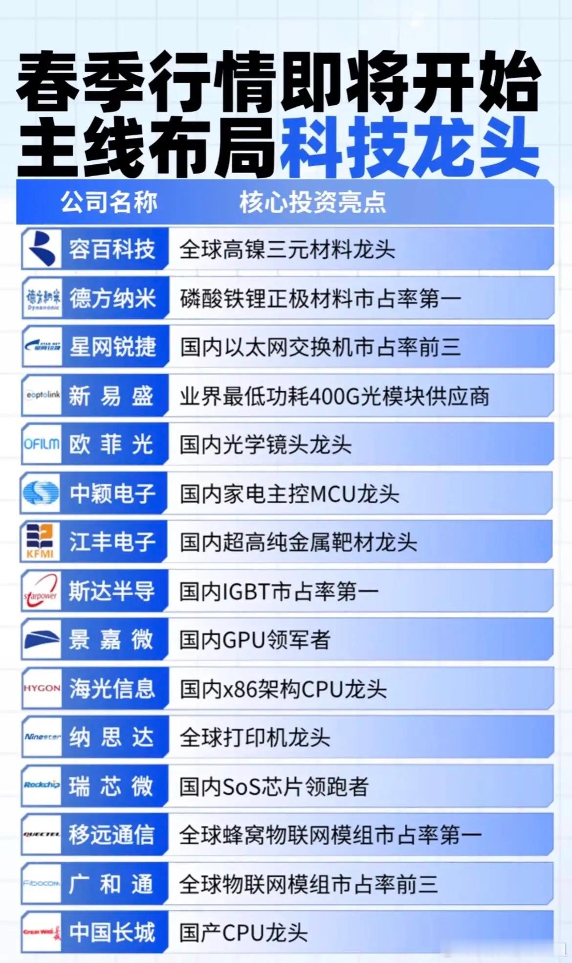 “春季行情即将开始 主线布局科技龙头”第一张图:聚焦半导体、电子制造与通信,包括工业富联(全球最大消费电子代工厂)、寒武纪(国内AI芯片领军者)、中芯国际(国内最大集成电路厂商)、北方华创、中微公司、沪硅产业、长电科技、兆易创新、豪威集团、立讯精密、海康威视、京东方A、中兴通讯、中际旭创、中科曙光。第二张图:覆盖人工智能、新能源、汽车电子、软件等领域,包括科大讯飞(国内语音识别龙头)、宁德时代(全球动力电池出货量第一)、四维图新、比亚迪、隆基绿能、阳光电源、三安光电、德赛西威、生益科技、深信服、用友网络、虹软科技、金山办公、中科创达、大族激光。第三张图:涉及新能源材料、通信设备、半导体、光学光电子等,包括容百科技(全球高镍三元材料龙头)、德方纳米、星网锐捷、新易盛、欧菲光、中颖电子、江丰电子、斯达半导、景嘉微、海光信息、纳思达、瑞芯微、移远通信、广和通、中国长城。