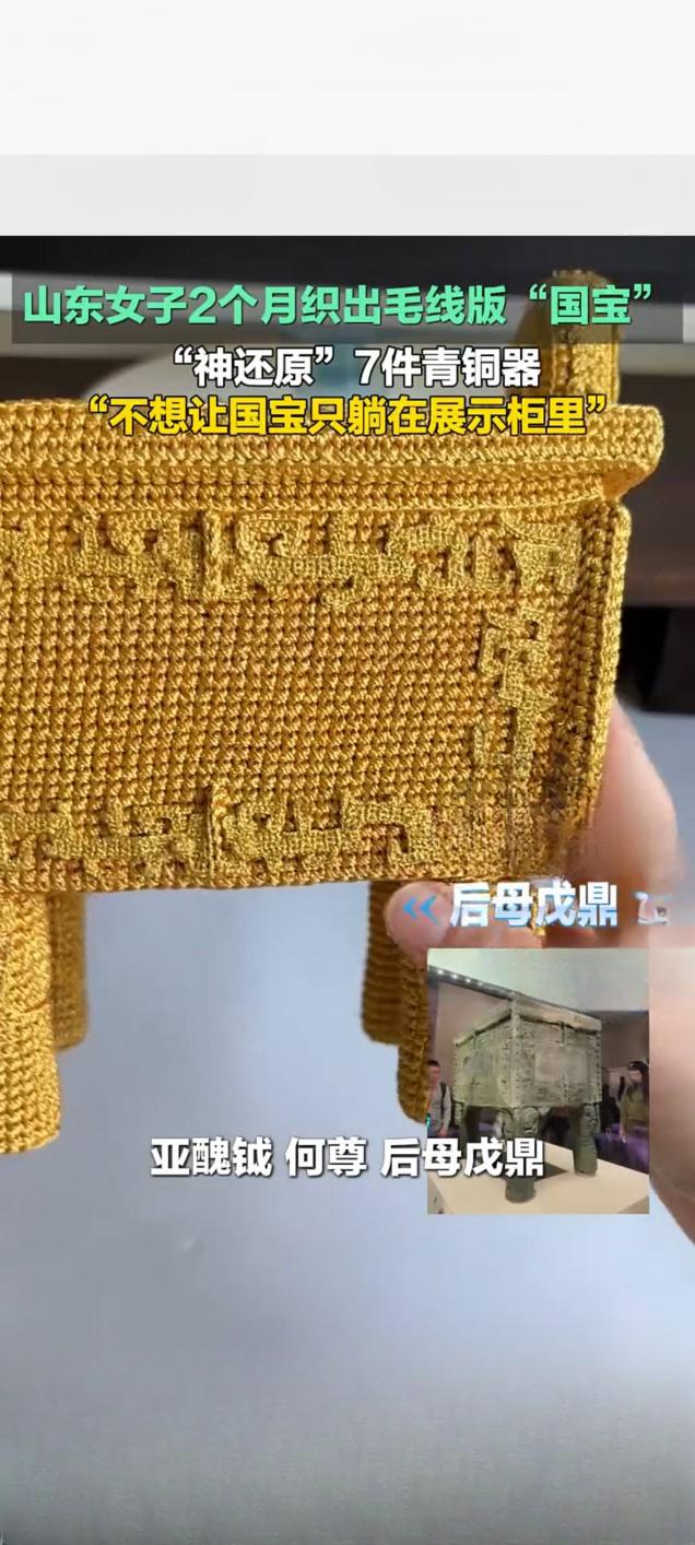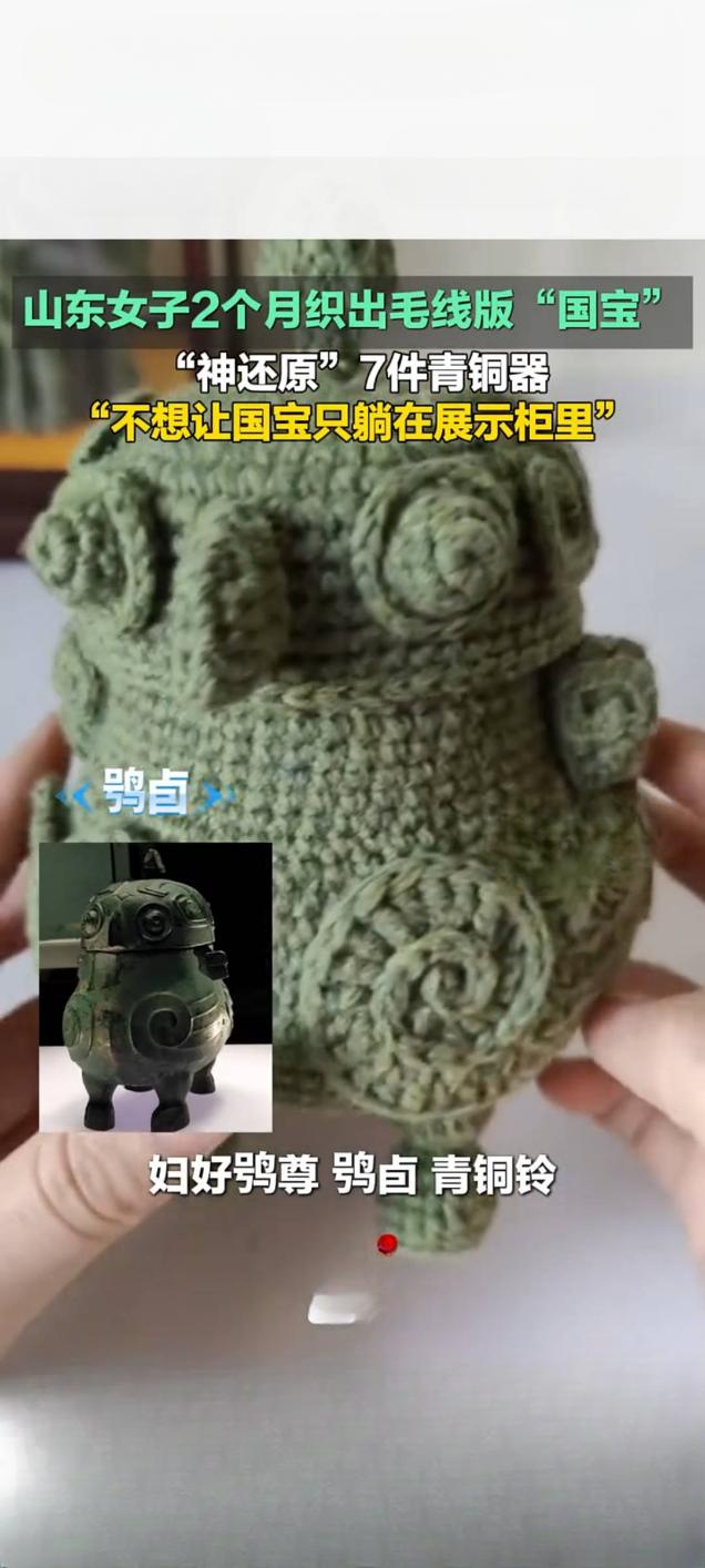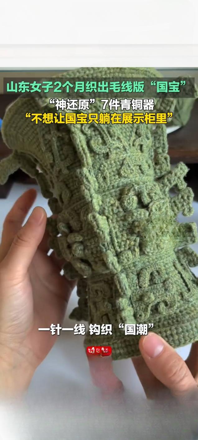 济南女子2个月织出7件毛线版“国宝” 神还原青铜器引热议 12月29日,山东济南一位手工艺人凭借精湛技艺走红快手,她耗时2个月精心编织的7件毛线版“国宝”青铜器,因造型逼真、细节考究引发网友广泛关注,相关作品播放量已达1.8万次。 据悉,这位女子出于对传统文化的热爱,希望让陈列在博物馆展示柜中的国宝“活起来”,便萌生了用毛线复刻青铜器的想法。从构思设计到选材编织,她全程亲力亲为,精准还原了青铜器的独特造型与纹饰细节,每件作品都尽显匠心。无论是器物的比例拿捏,还是纹理的细腻呈现,都展现出极高的手工水准,让网友纷纷赞叹“巧手神还原”“这才是传统文化的创意传承”。 该作品在快手平台发布后,迅速收获众多好评。网友“凤舞九天0742”留言“好厉害”,网友“哥我郭”调侃“我们的都是树叉子”,言语间满是认可;还有网友直言“上交吧”,表达了对作品的高度赞赏。 用毛线编织的方式复刻国宝,不仅为传统文化注入了生活气息与创意活力,也让更多人感受到了文物之美与手工之趣。这种创新传承方式,既拉近了大众与传统文化的距离,也为非遗传承与文化传播提供了新思路。毛线手作美学 非遗传承 心灵手巧