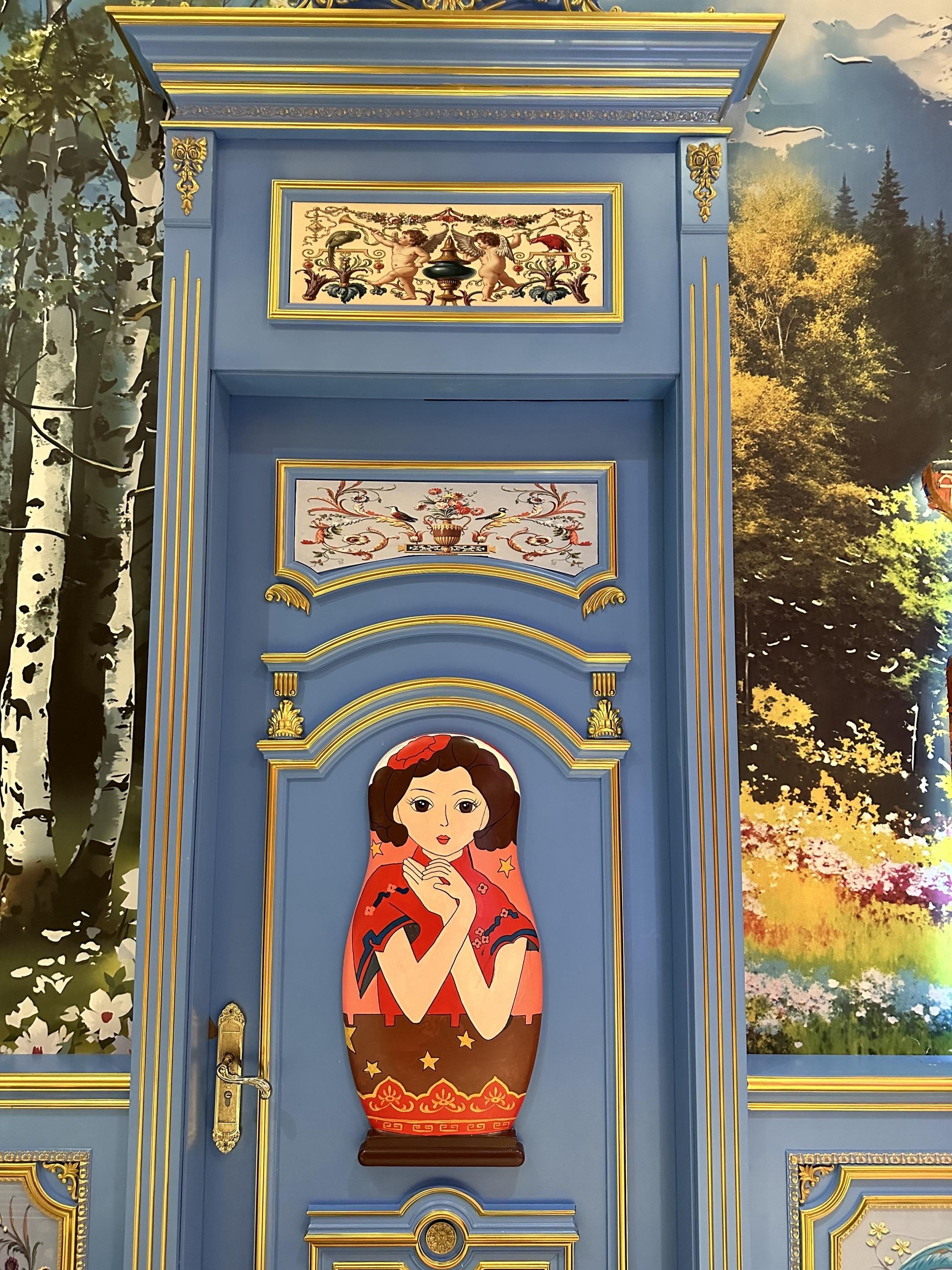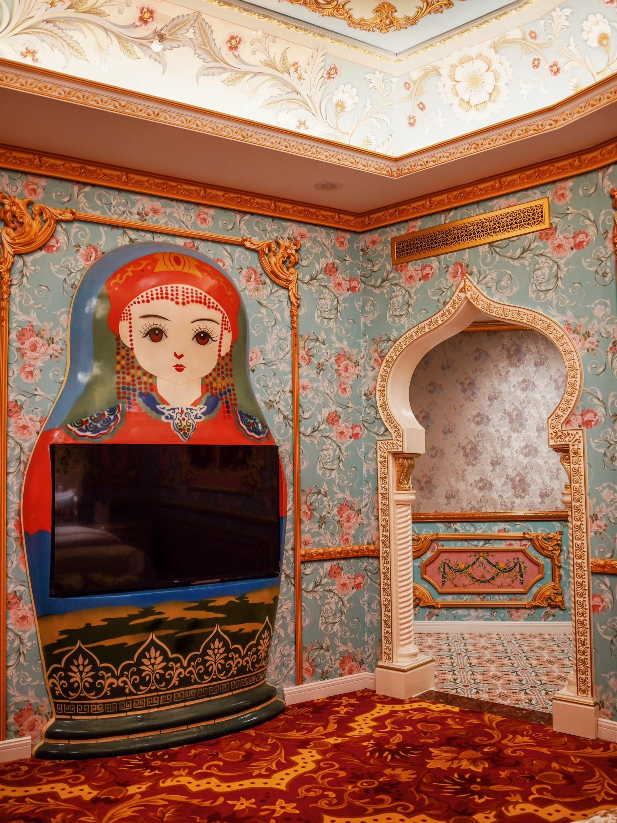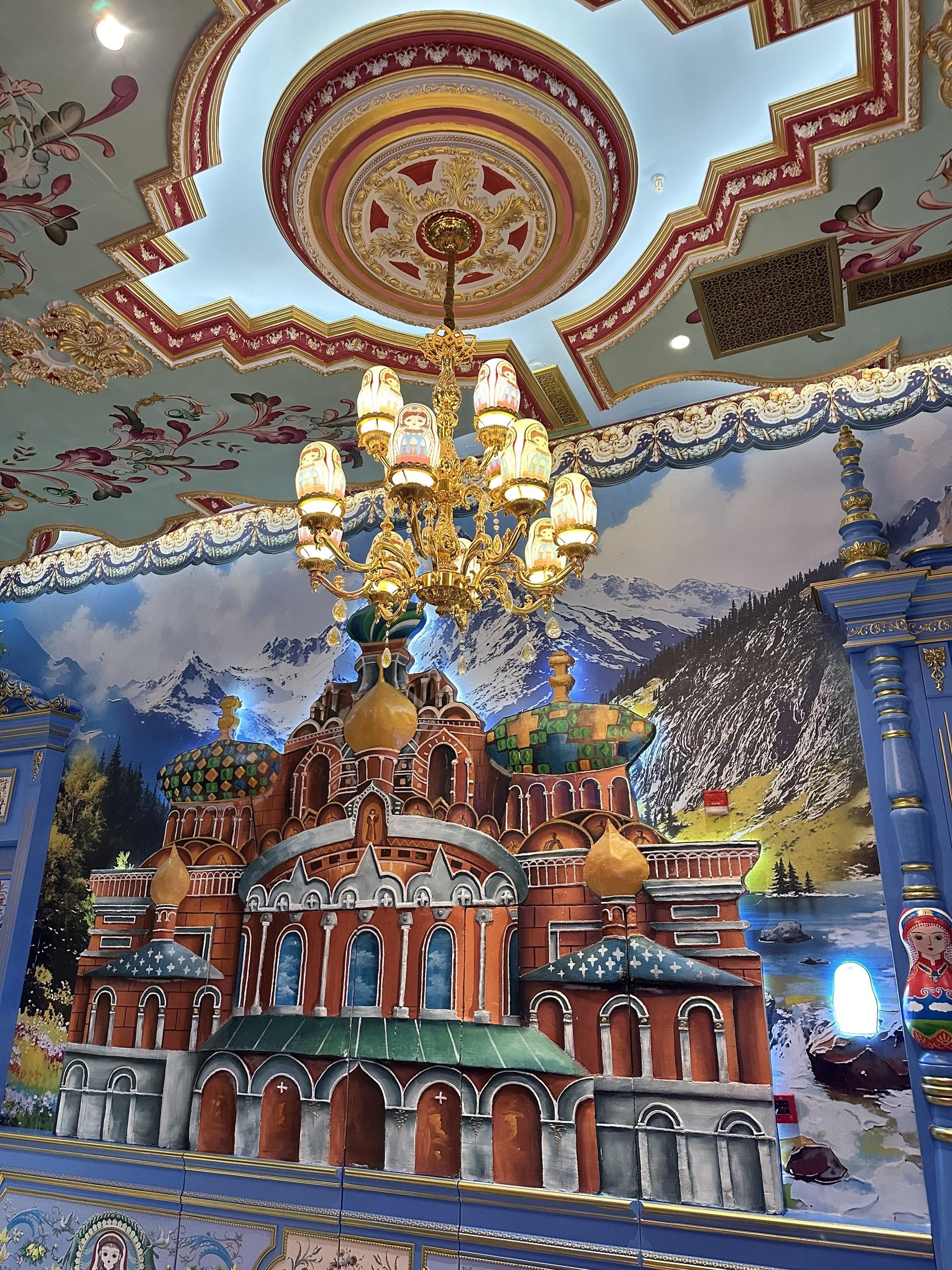 LED灯一闪一闪,套娃的眼睛还在眨,仿佛一个活的娃娃站在雪夜中对我笑~雪光 + 灯光,氛围直接浪漫到窒息。走进大堂更是惊到捂嘴,金碧辉煌、五彩斑斓,仿佛闯进俄罗斯童话城堡🕌到处都是套娃图案,从墙壁到装饰,异域风情拉满~