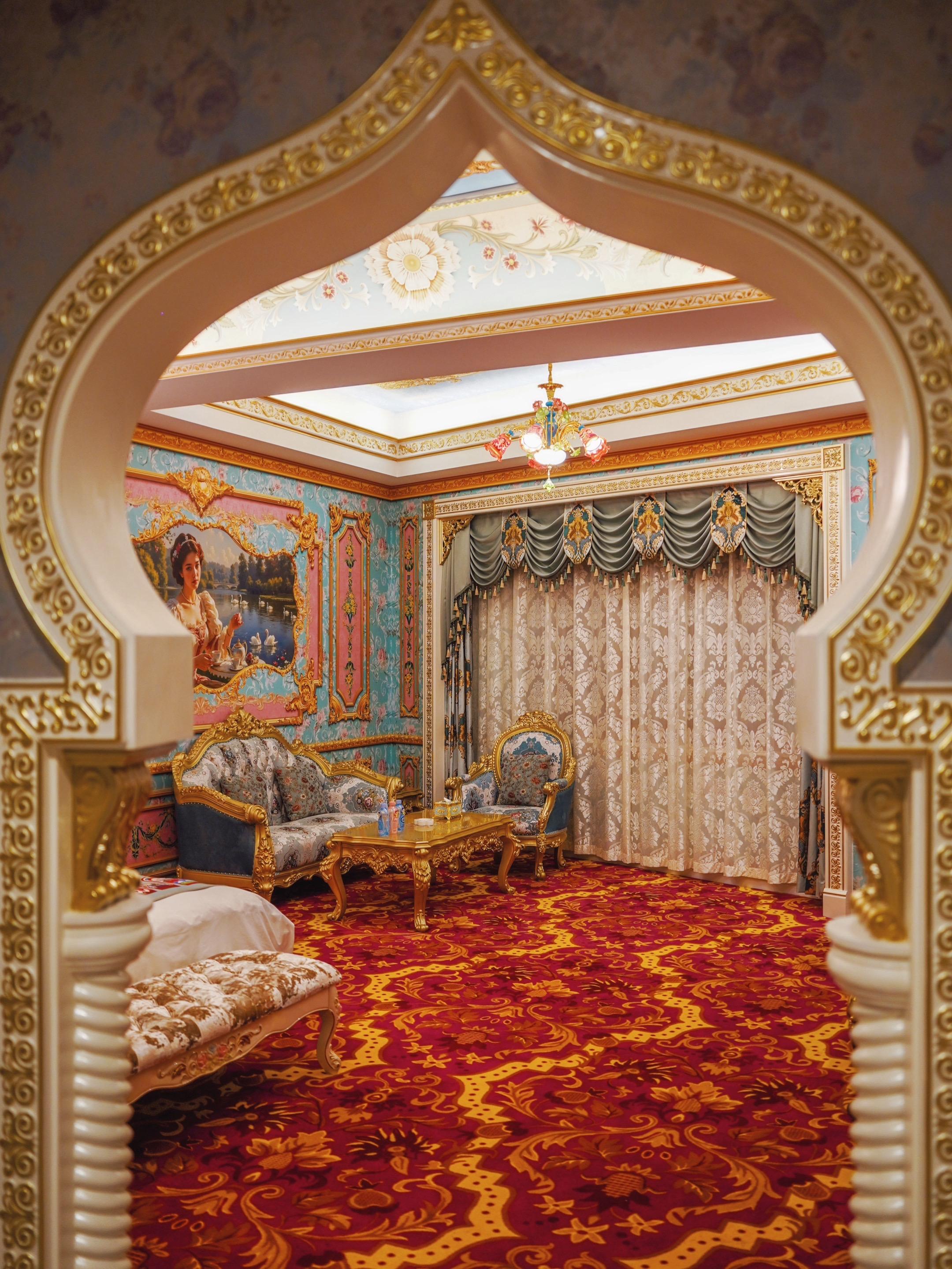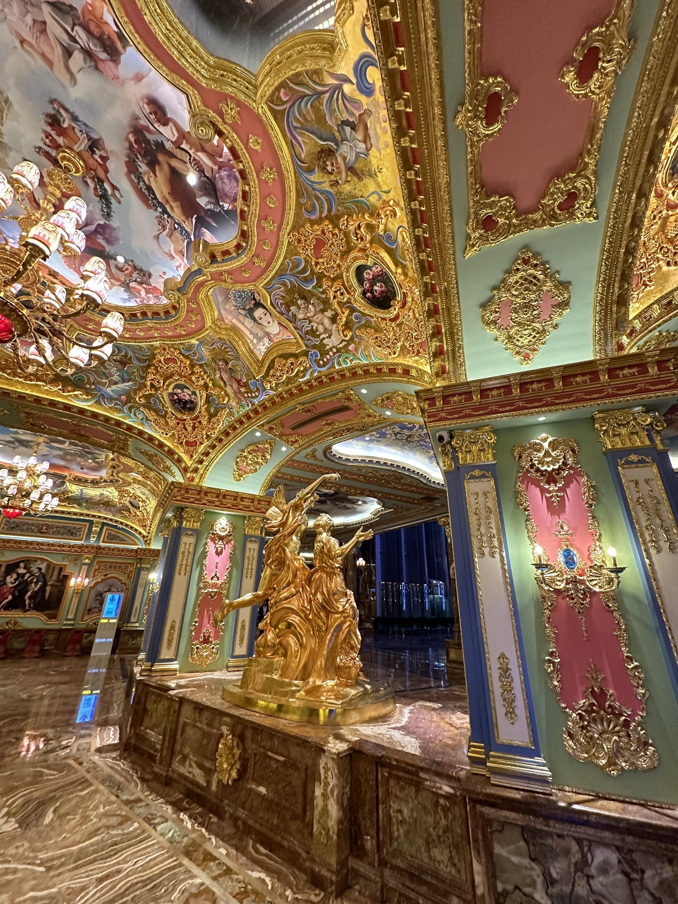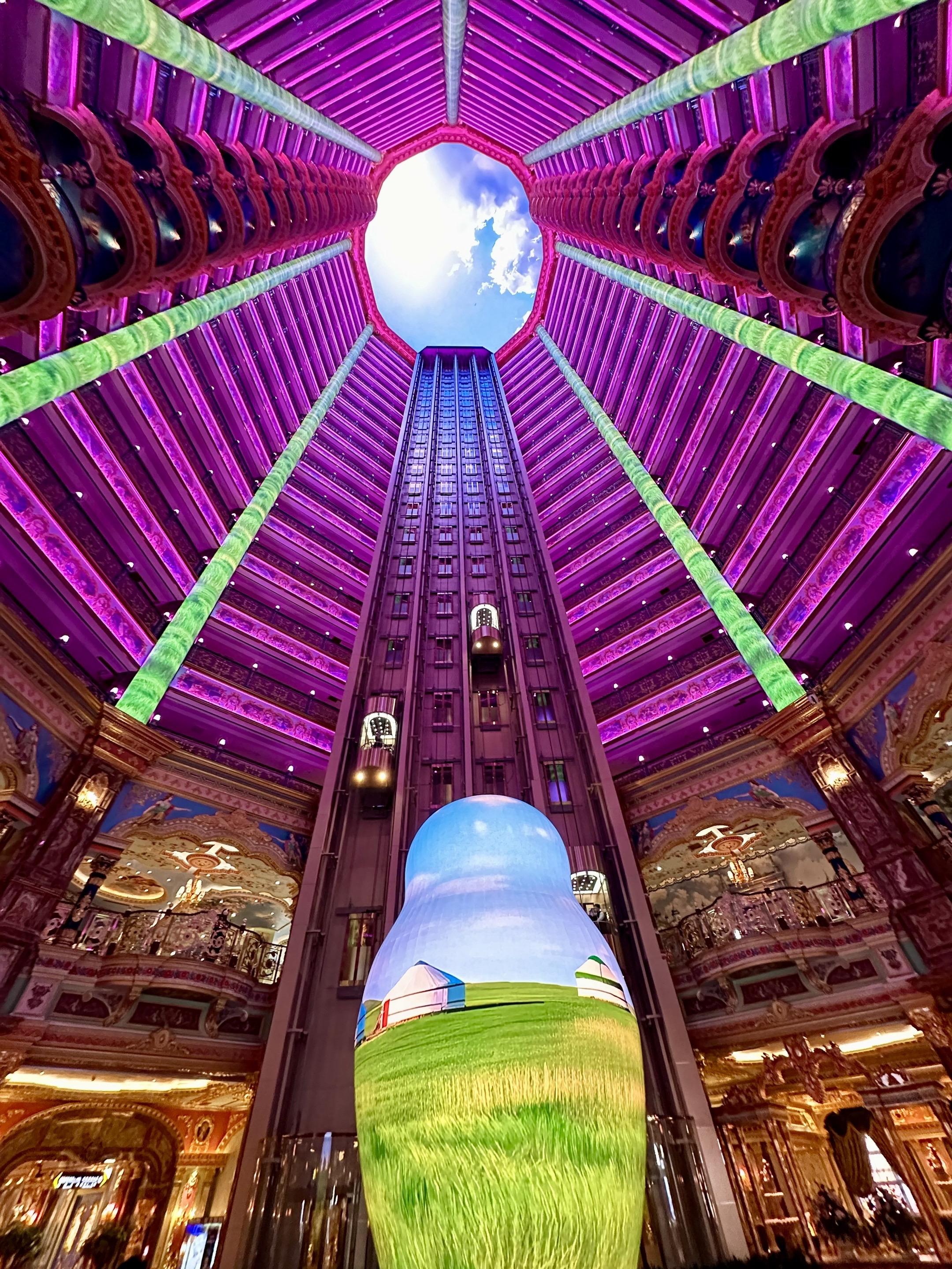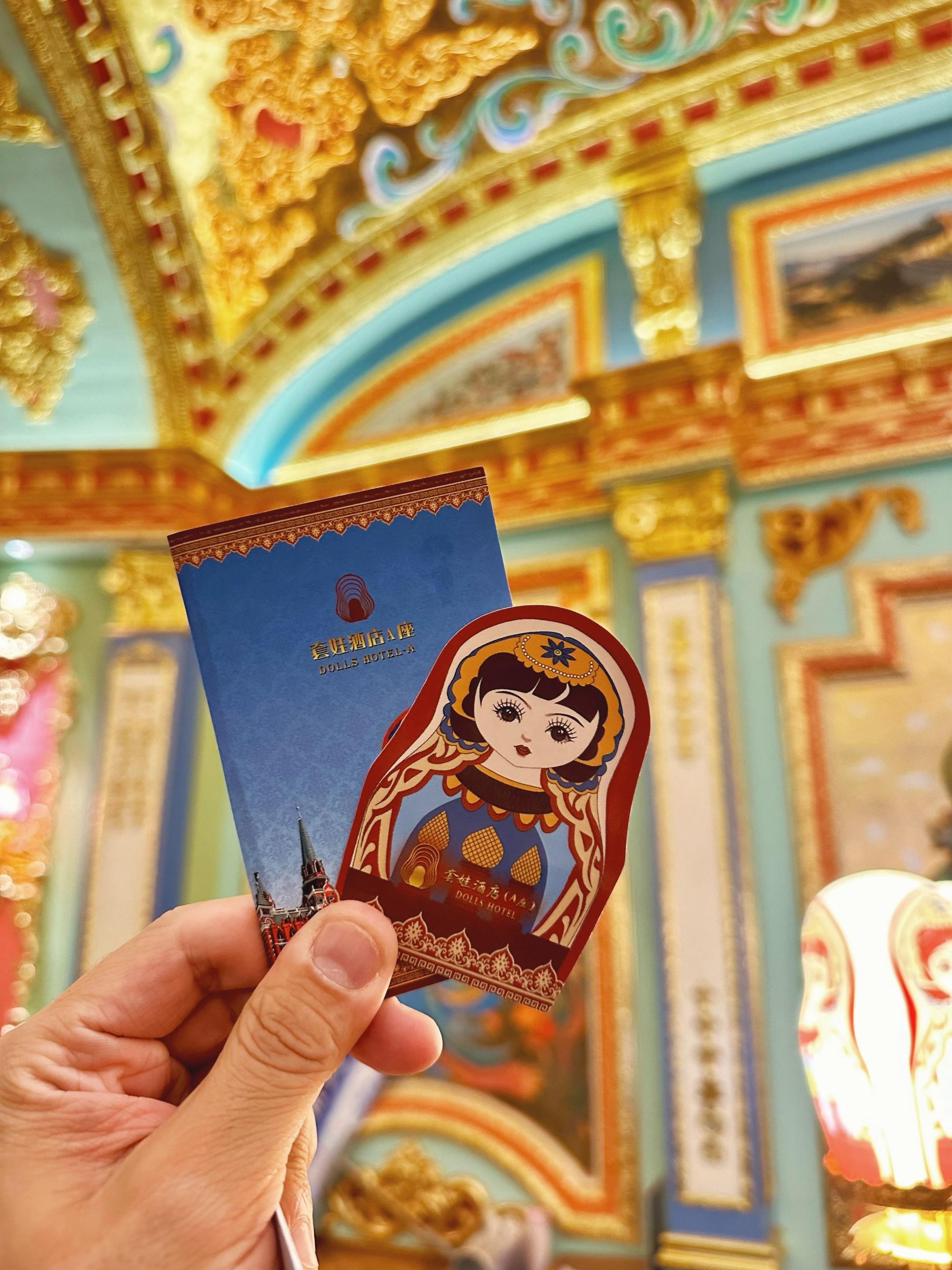 LED灯一闪一闪,套娃的眼睛还在眨,仿佛一个活的娃娃站在雪夜中对我笑~雪光 + 灯光,氛围直接浪漫到窒息。走进大堂更是惊到捂嘴,金碧辉煌、五彩斑斓,仿佛闯进俄罗斯童话城堡🕌到处都是套娃图案,从墙壁到装饰,异域风情拉满~