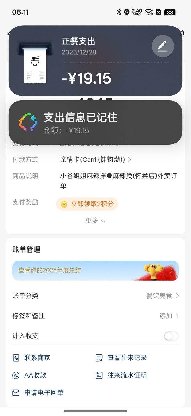 更重要的是,一键闪记并不局限于文章生成总结这一单一场景。扫码支付完成后,同样可以通过三指上滑,自动识别支付金额、时间等关键信息,并完成记录。这意味着,哪怕不主动打开记账类App,也可以在系统层面完成信息留存。