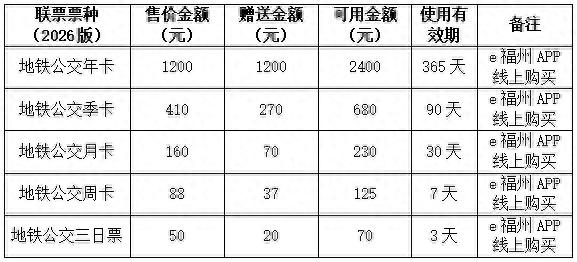 其中,联票2026版为电子期限票,赋予固定金额,在有效期内可在福州地铁全部运营线路及市本级公交企业所属的市辖区一元一票制和两元一票制公交线路使用。