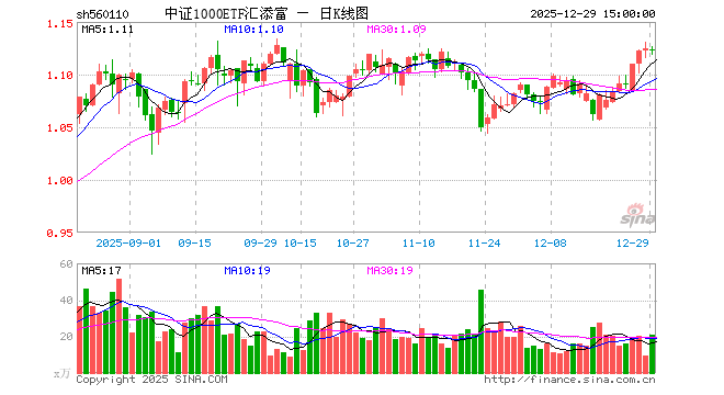12月29日,中证1000ETF汇添富(560110)跌0.18%,成交额2344.07万元。当日份额减少900.00万份,最新份额为1.55亿份,近20个交易日份额增加0.00份。最新资产净值计算值为1.74亿元。