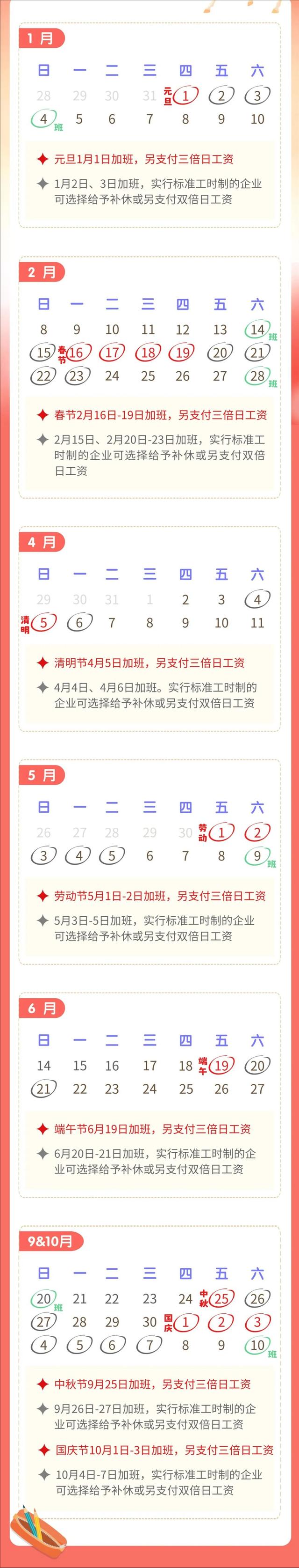 2月15日(农历腊月二十八、周日)至23日(农历正月初七、周一)放假调休,共9天。2月14日(周六)、2月28日(周六)上班。