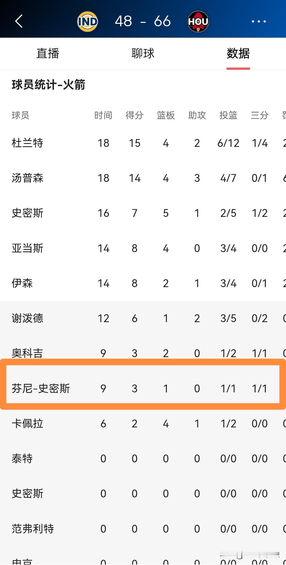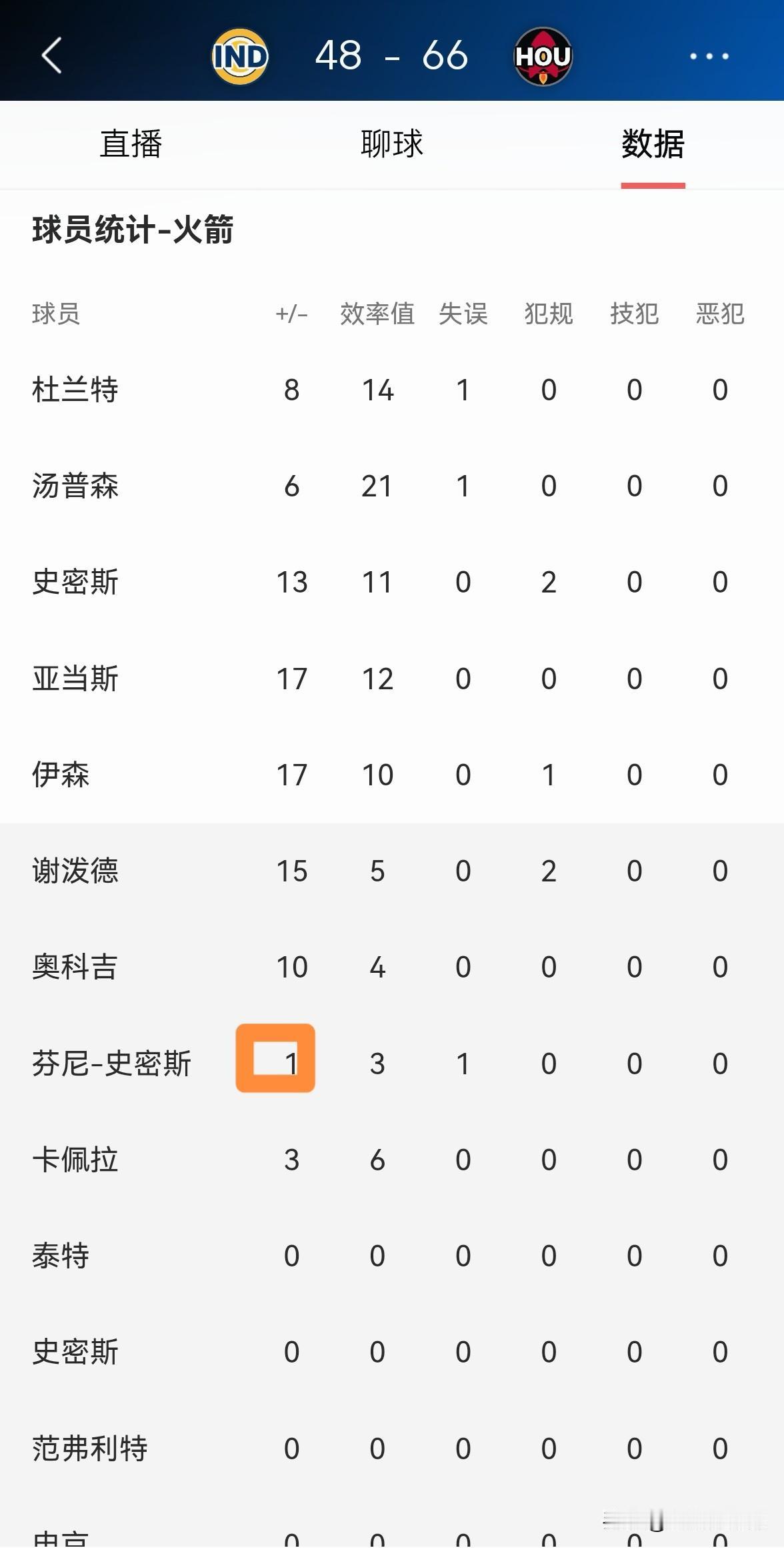 火箭大将芬尼-史密斯的场上正负值真是太低了!在今天火箭主场迎战步行者的上半场比赛中,芬尼-史密斯替补出战9分钟,三分球1中1得到3分1篮板,还有1次失误,他的场上正负值为全队最低的+1。 老实说,全队最低的场上正负值说明芬尼-史密斯的场上效果并不好,他拖了球队的后腿。