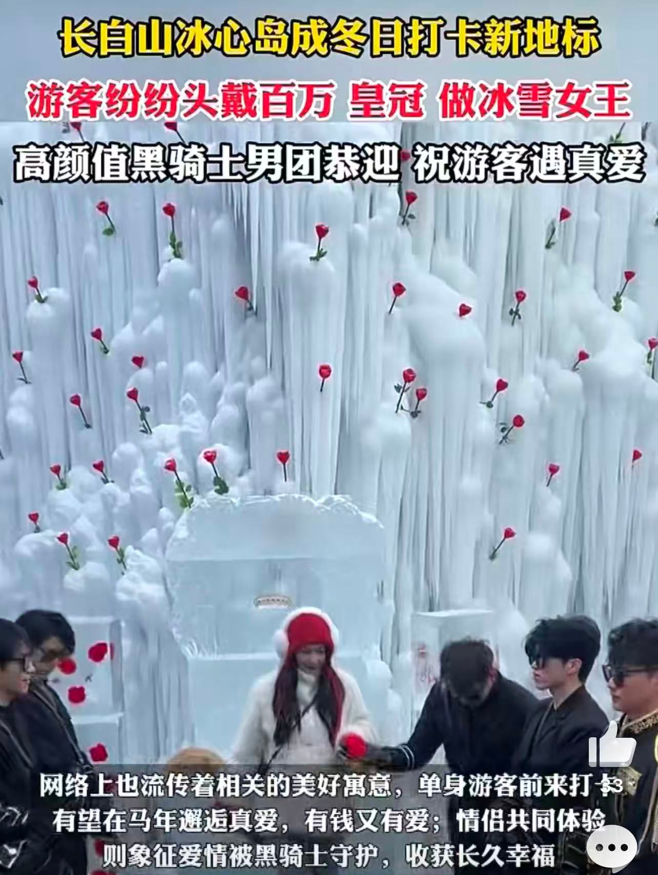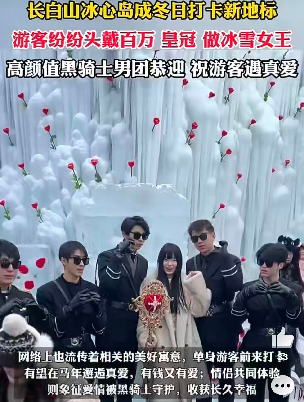 起猛了在长白山看到冰雪女王了长白山冰心岛藏着超绝打卡点!百万冰封皇冠加持的冰封王座超吸睛,六位高颜值黑骑士列队迎候,坐上瞬间变身氛围感拉满的冰雪女王!被长白山黑骑士宠成冰雪女王了