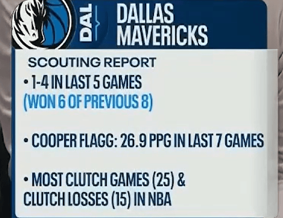 第一节比赛中,转播方列出数据,独行侠目前战绩12胜21负,打了25场关键时刻联盟第一,输了15场关键时刻也是联盟第一。