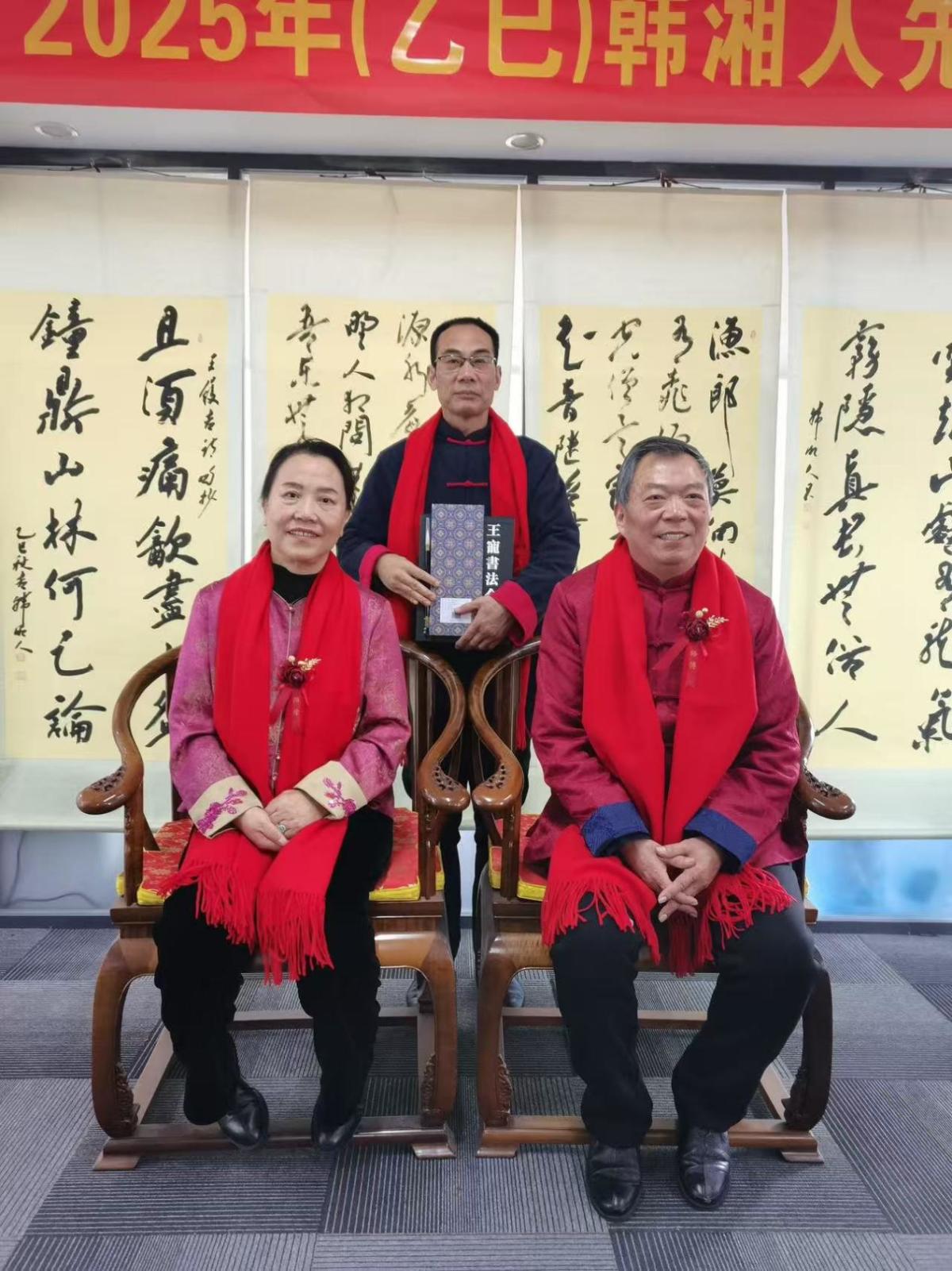 上午10时18分,仪式在古朴雅致的氛围中拉开帷幕。现场布置简洁庄重,韩湘人先生近年来的代表作品悬挂堂前,墨香四溢。11位新徒统一身着传统服装,依次向师父韩湘人(下图右)、师母(下图左)崔爱武行拜师礼、奉《拜师帖》、呈“束修六礼”、“三敬茶”。韩湘人老师郑重回赠每位弟子一套历时二十载精心编撰的《王宠书法全集》(四卷)、王宠《草书千字文》、《韩湘人书法精品册》、毛笔、亲笔书写的四字箴言,寄托对传承的期许。