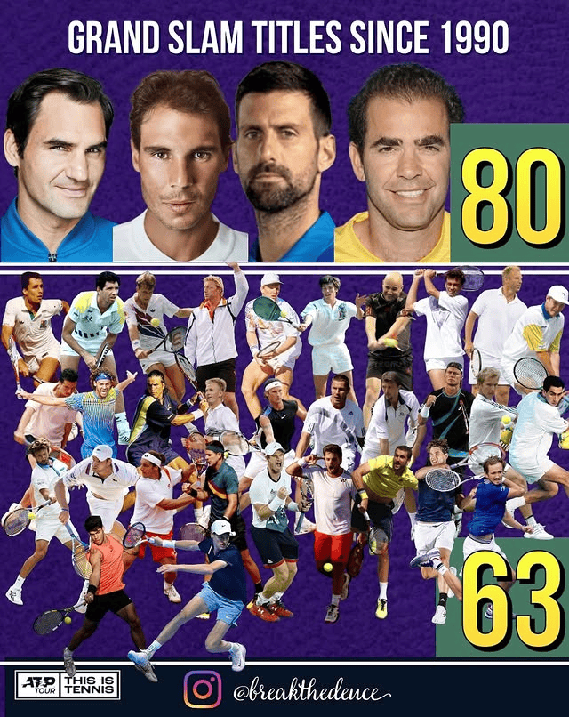 虎扑12月30日讯近日,外媒breakthedeuce更新社媒,晒出一项数据:从1990年开始,男网在26年里产生的143个(2020年温网停办)大满贯,80个被德约科维奇、纳达尔、费德勒和桑普拉斯所夺,剩下63个由31个球员瓜分。