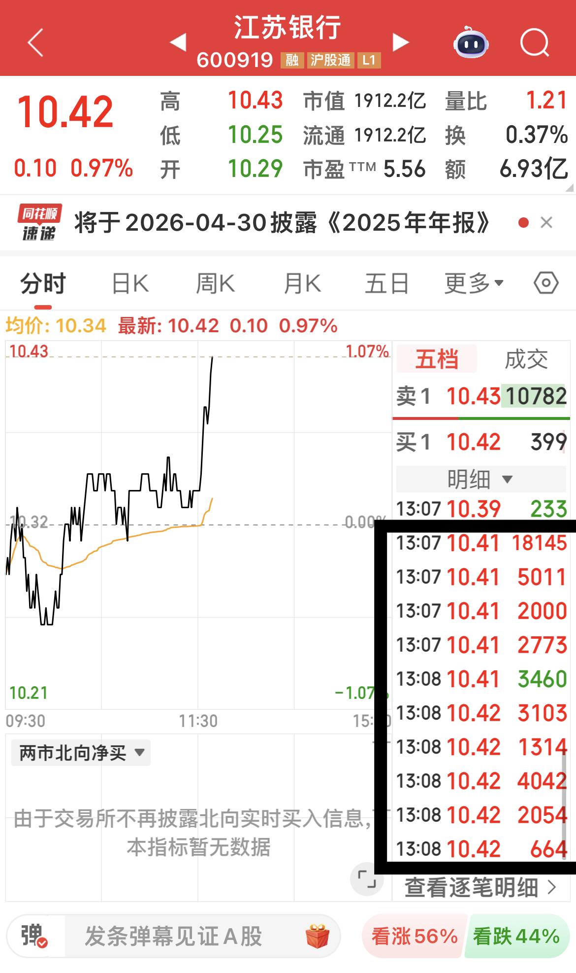 午后:13:03分,江苏银行出现1万手买单,13.07分出现1.8万手买单……
