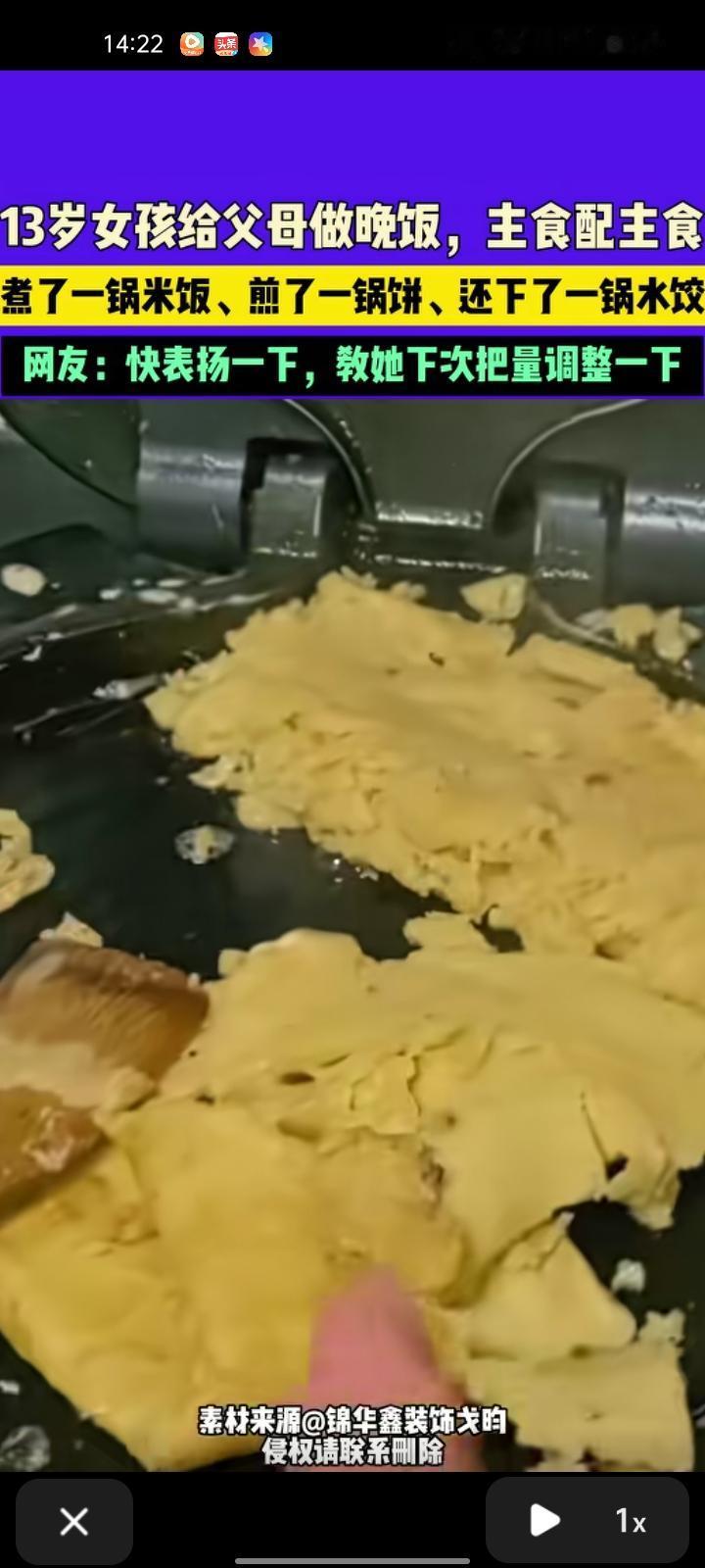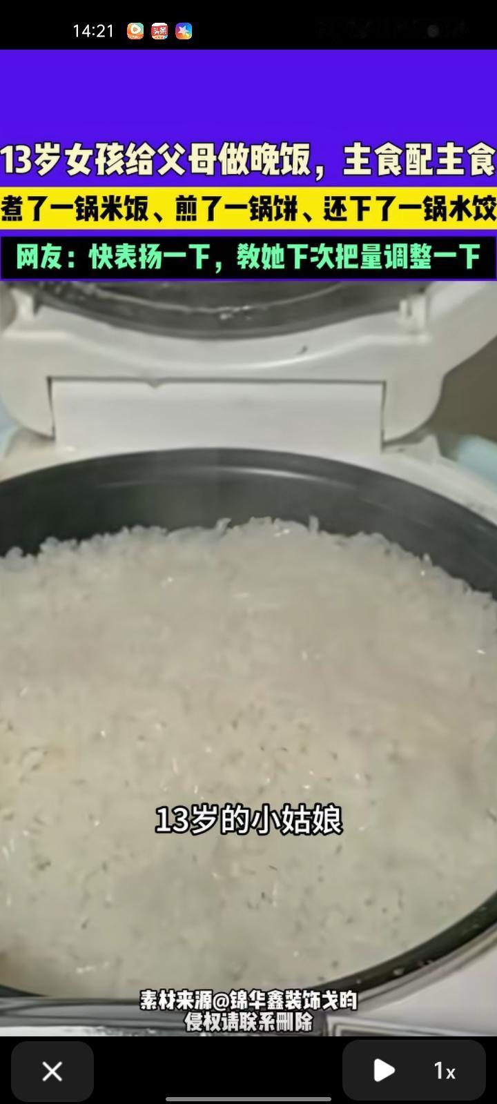 12月29日,苏州昆山市。网友晒视频称,自家13岁女儿做完饭,主食配主食。煮了满满一锅米饭,煎了一锅饼,还煮了一锅水饺,主食配主食让自己感到震惊。 有网友表示:快表扬一下,教她下次把量调整一下