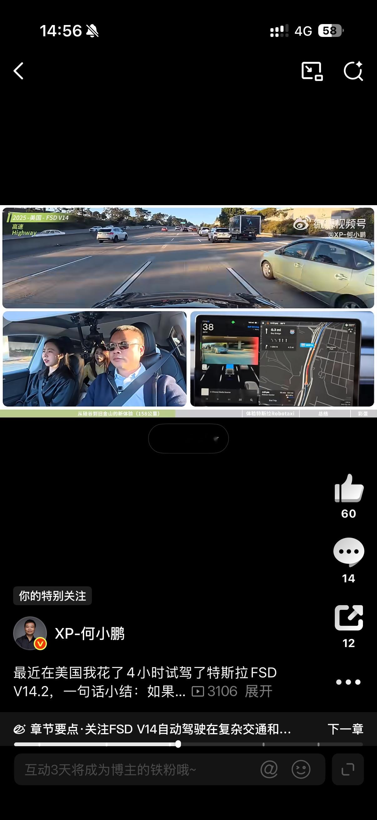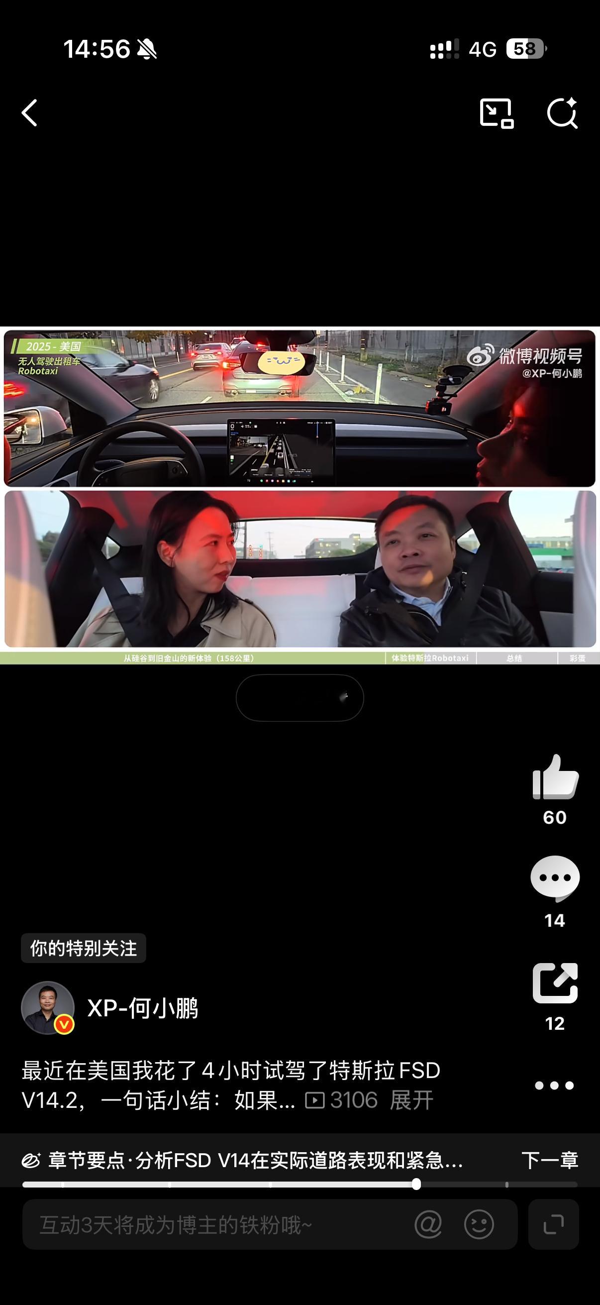 【】12月30日, 发布在美国体验特斯拉FSD的视频。何小鹏表示,去年FSD还只是“不错的L2辅助驾驶”,而最新版本已经让他看到L4无人驾驶近在眼前。何小鹏邀请马斯克在2026年底,和特斯拉的“满血版”系统在欧洲市场上全面竞技。何小鹏还预言,明年无论美国还是中国,全自动驾驶会真正到来,直接从L2到L4。