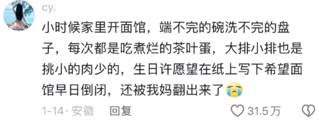 小时候家里开面馆,端不完的碗洗不完的盘子,每次都是吃煮烂的茶叶蛋,大排小排也是挑小的肉少的,生日许愿望在纸上写下希望面馆早日倒闭,还被我妈翻出来了