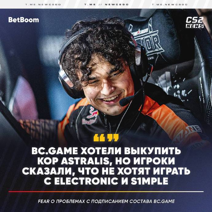 fEAR:BC.GAME方面曾想要收购Astralis战队的核心阵容,但A队的选手们表示,他们不想和electronic以及s1mple并肩作战。