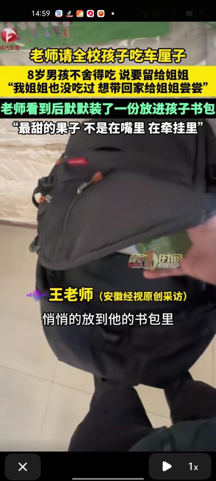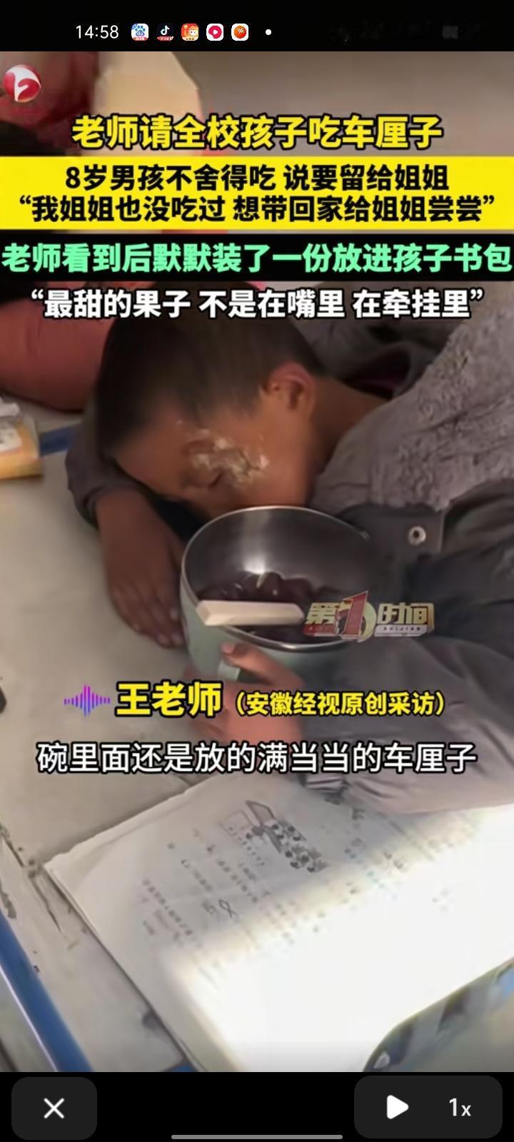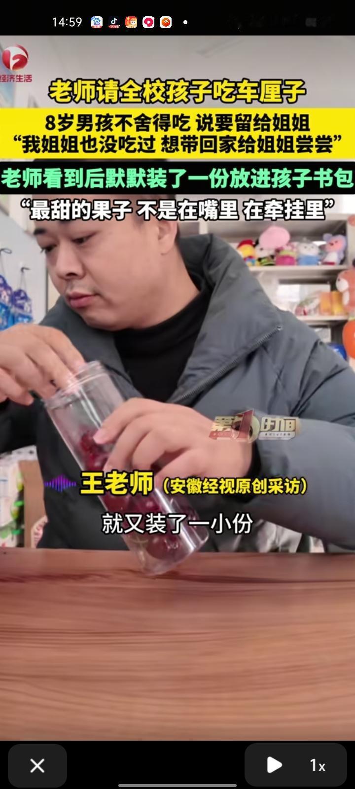 12月26日,南阳市淅川县。老师请全校孩子吃车厘子,有位男孩舍不得吃,说要留给姐姐尝尝。然而到午休之后,这位男孩睡觉的时候抱着那个碗,老师看到后非常感动,默默装起一份在他书包里,给他一个惊喜。