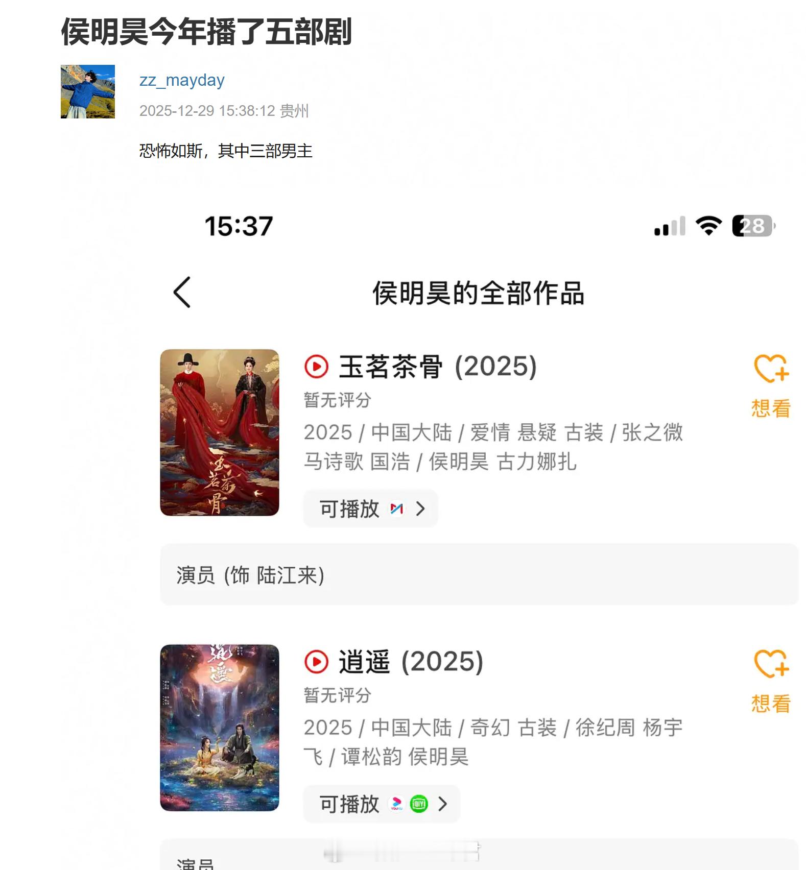 豆瓣在讨论侯明昊今年播了五部剧,恐怖如斯,其中三部男主。主打一个古偶啊。但好像都