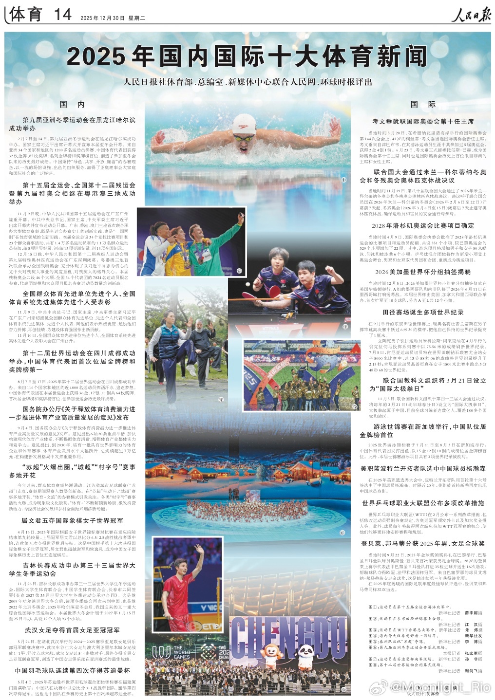人民日报评出2025国际十大体育新闻世界乒乓球职业大联盟(WTT)在2月公布一系列改革措施,包括修改运动员强制参赛规定、为奥运冠军颁发外卡以及加大奖金投入等。此外,球员每年将获得两次豁免参加WTT冠军赛的机会,使他们能够更好地安排赛程和规划。林诗栋蒯曼登上人民日报WTT改革入选国际十大体育新闻