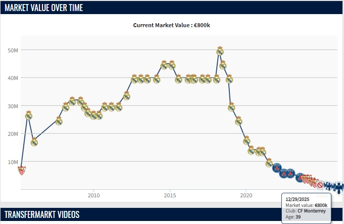直播吧12月30日讯昨日德转更新了墨西哥超球员身价,39岁的拉莫斯身价跌破百万,目前仅剩80万欧。