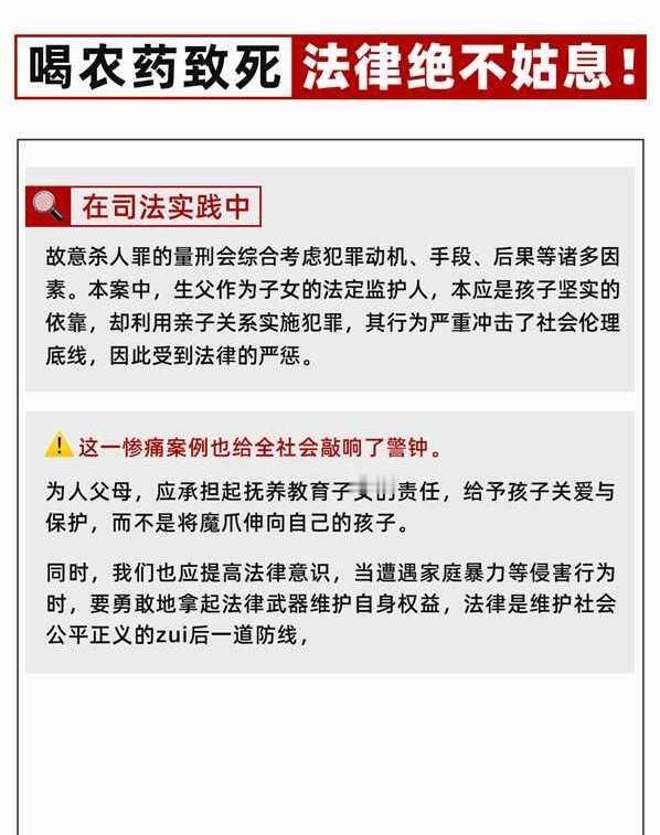 生父哄骗子女喝农药致死,法律绝不姑息! ❗❗近日,一则“生父哄骗两子女喝农药致死被判死刑”的消息冲上热搜, 令人痛心又愤怒。孩子本是父母掌心的宝, 却惨遭亲生父亲如此毒手,让人难以接受。 - 1️⃣法律层面来看,这位生父的行为构成故意杀人罪。 故意杀人,是指故意非法剥夺他人生命的行为, 这是严重的侵犯公民人身权利的犯罪。 父母对子女负有抚养、教育和保护的法定义务,而此生父不仅没有履行应尽的责任,反而以哄骗的方式让子女喝下农药,剥夺了两个幼小生命,主观恶性极深,社会危害性极大。法律对于这种严重侵犯生命权、违背人伦道德的犯罪行为,向来持零容忍态度,判处死刑正是法律公正的彰显。 - 2️⃣在司法实践中,故意杀人罪的量刑会综合考虑犯罪动机、手段、后果等诸多因素。本案中,生父作为子女的法定监护人,本应是孩子坚实的依靠,却利用亲子关系实施犯罪,其行为严重冲击了社会伦理底线,因此受到法律的严惩。 - ⚠这一惨痛案例也给全社会敲响了警钟。 为人父母,应承担起抚养教育子女的责任,给予孩子关爱与保护,而不是将魔爪伸向自己的孩子。 👉同时,我们也应提高法律意识,当遭遇家庭暴力等侵害行为时,要勇敢地拿起法律武器维护自身权益,法律是维护社会公平正义的zui后一道防线 贵州故意杀人案 一审宣判 法律严惩 未成年人保护 家庭纠纷处理 贵州男子毒杀亲生儿女案 坚决打击犯罪