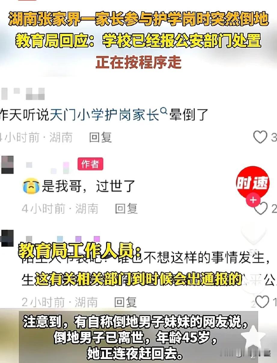 张家界去世的这位学生家长让人看着心痛!站在马路上维持秩序没多久,便突发疾病去世了,留下了两个可怜的孩子需要照顾,老大今年17岁,老二在事发小学读三年级! 原来,这位家长今年才45岁,自身患有一些基础性疾病,那天在马路上站了大约20分钟便发病了,去世前还曾跟其他家长聊天。 该家长去世后,当地教育部门说的话让人感到气愤,表示该家长是自愿参与护学值岗的。 说这句话的人完全是在逃避责任,学生家长要是不来值岗的话,学校会愿意吗? 现在当务之急的是要帮助处理好该家长去世的后事,安抚家属受伤的情绪,做好相应的善后赔偿!