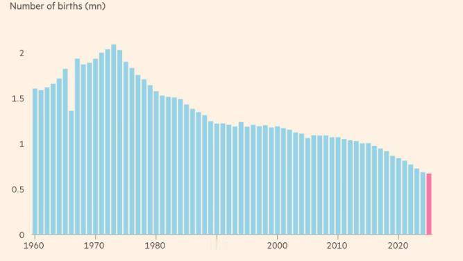 【连续十年创新低!日本2025出生人口创126年最低】2025年日本出生人口数据预测出炉,形势远超政府最坏预期。人口统计专家依据今年前10个月初步数据推算,2025年日本新生儿总数或低于67万,将创下1899年有记录以来的最低水平,较政府原预测的68.1万“低变种”值仍有差距,更比2023年更新的74.9万中等预测值大幅下滑,且较“2041年不低于67万”的预测提前16年破线。 这已是日本出生率连续第十年创新低,2025年出生数预计较2024年的68.6万下降3%。当前日本结婚人数不足50万,仅为1972年峰值的一半,2024年人口已减少90多万人。首相高市早苗虽设立人口战略总部应对这一“最大问题”,2024年更拨款230亿美元推行三年催生计划,但收效甚微。同时公众对移民流入抵制情绪高涨,民粹政党因此选举得利,加剧了政策平衡难度。专家还关注2026年“火马年”迷信可能的影响,不过多数观点认为年轻一代对此关注度低,难对生育行为产生显著影响。 日本2025年出生人口跌破政府最低预期,标志着其少子化危机进入更严峻阶段。长期以来,日本结婚率低迷、晚婚晚育成常态,核心人口增长动力持续萎缩,而政府大额催生投入未达预期,凸显单一经济刺激难以破解深层社会结构性问题。移民政策因民意阻力难以推进,进一步堵死了人口补充的重要路径。这一危机不仅将加剧劳动力短缺、加重社保负担,更会对经济增长潜力和社会活力产生长远冲击。未来,日本需突破传统观念束缚,在育儿福利、就业环境、移民政策等方面构建系统性解决方案,否则人口萎缩的恶性循环将持续深化,成为制约其发展的核心瓶颈。
